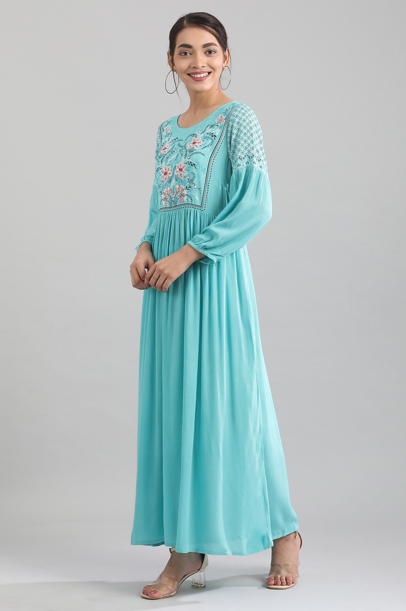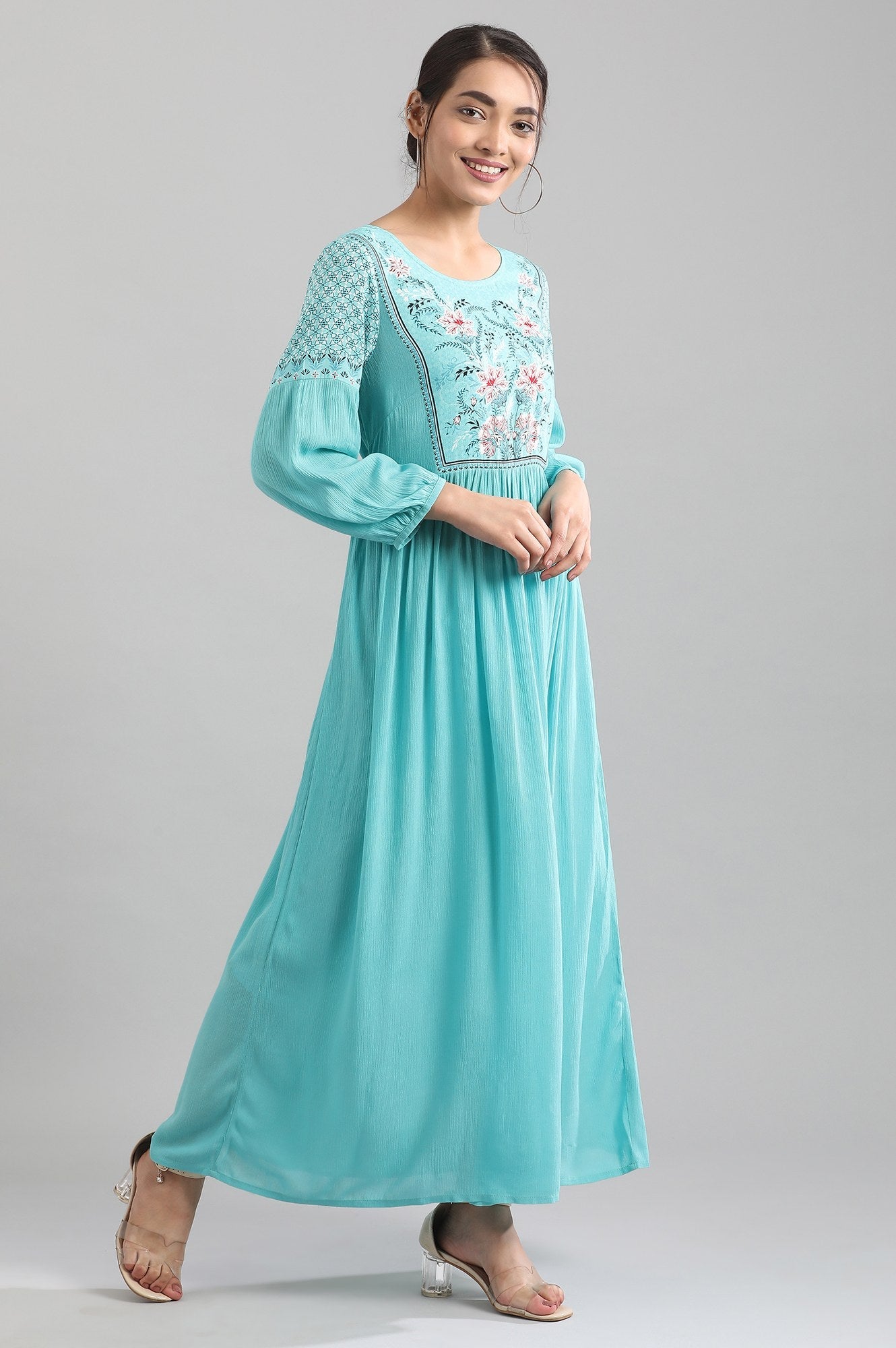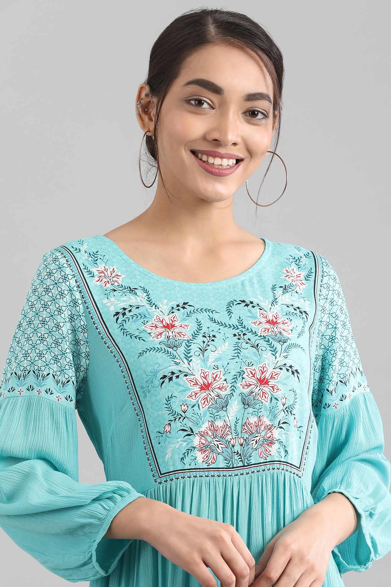 Blue round neck Liva dress with gathers at waist and floral print detail.