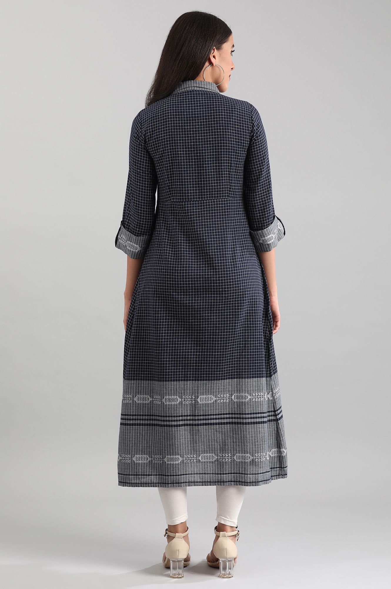 Blue shirt collar A-line kurta with gathers, placket detail and checkered pattern. This is exclusively from Disha's must-have closet.