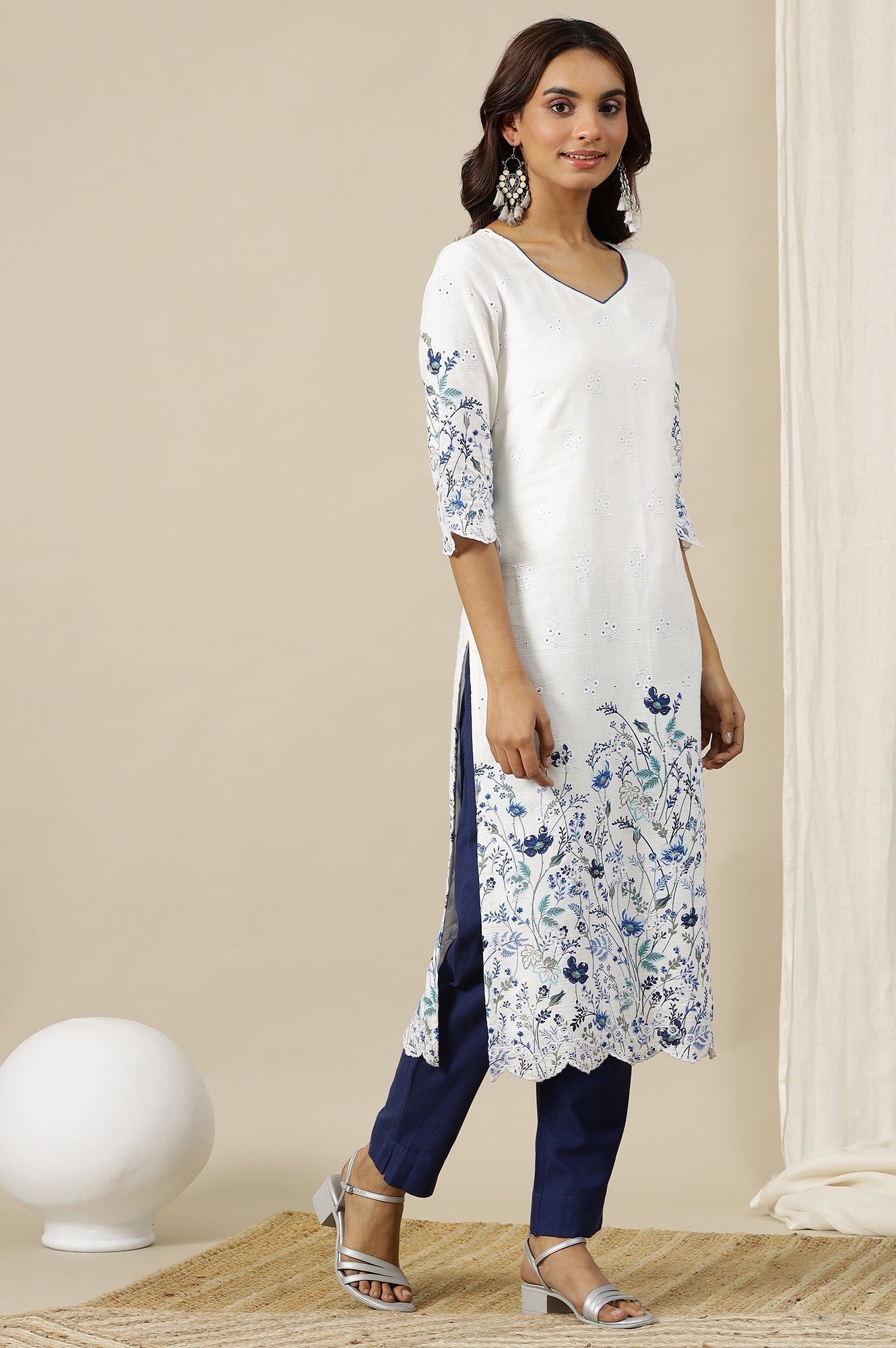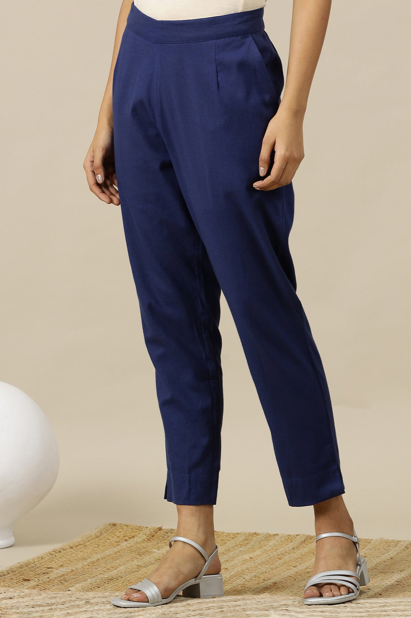 Blue Solid Cotton Flax Straight Fit Trousers