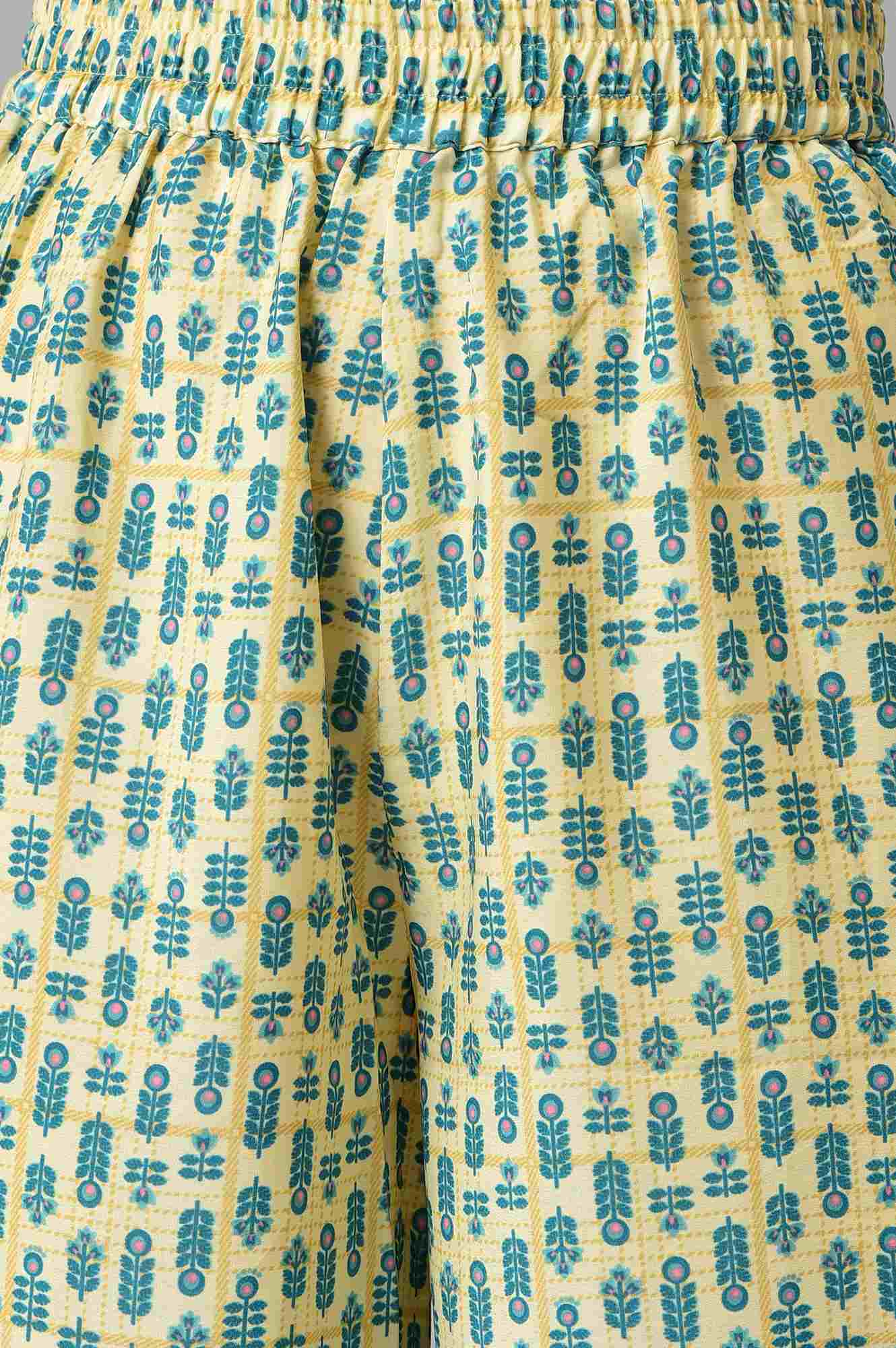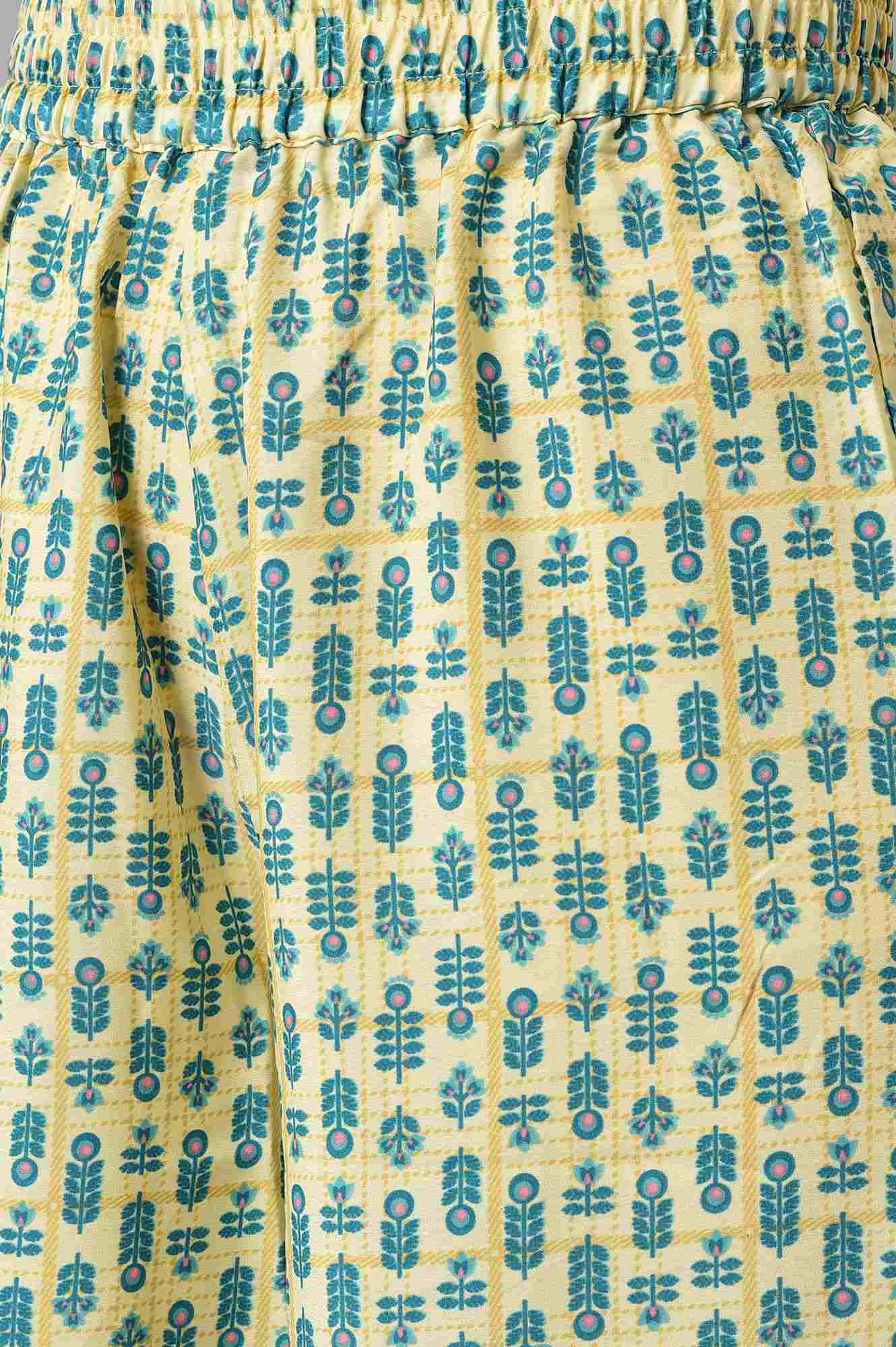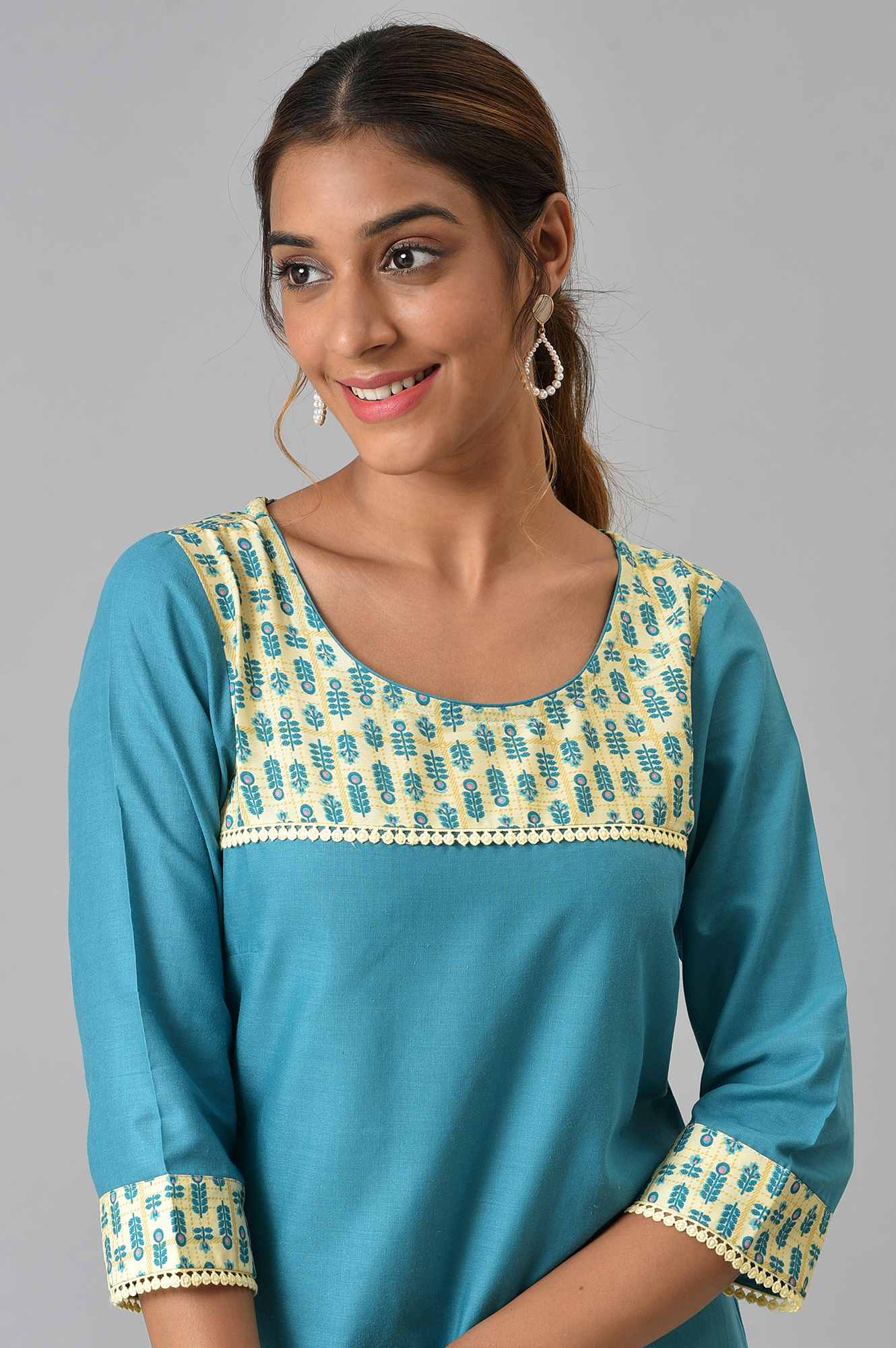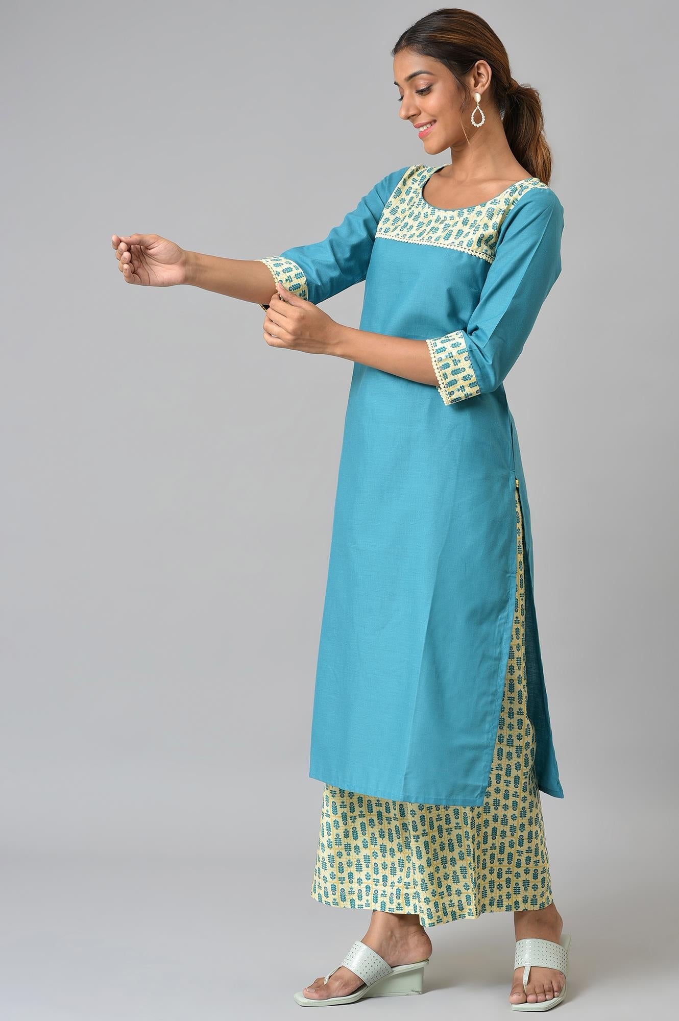 Be Ready For The Weekend-Chilling Look In This Chic Blue Solid kurta And Yellow Printed Trousers Set. The kurta Has Round Neck And Designed In Straight Silhouette. And The Trousers Have Floral Print On It.