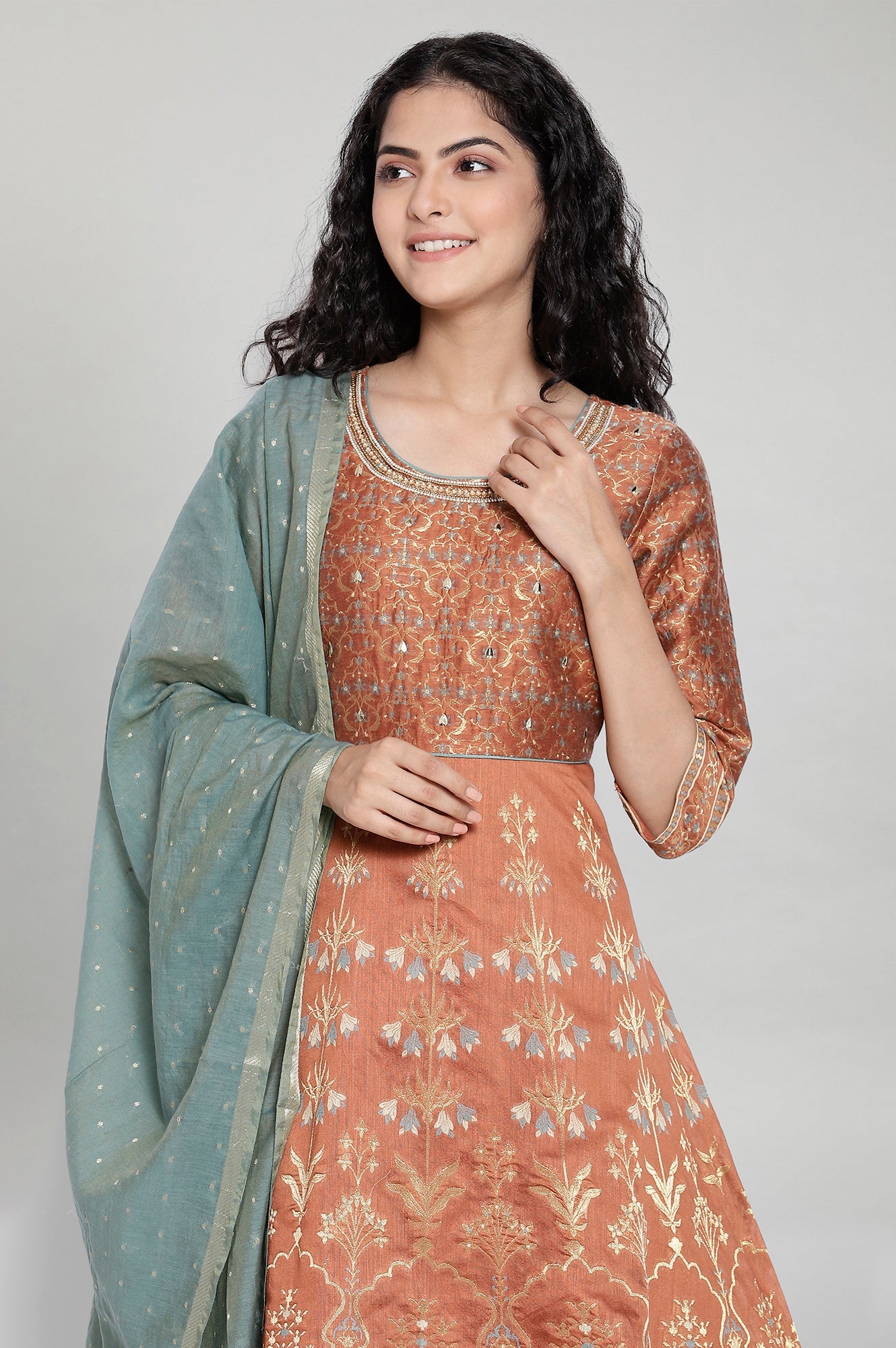 Brown coloured round neck dress having three-fourth sleeve and printed detail. It features embroidery detail and flared hem. Paired with a blue printed dupatta.