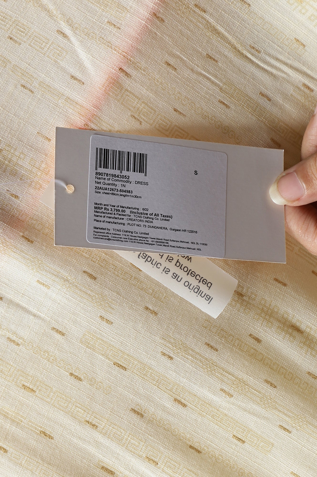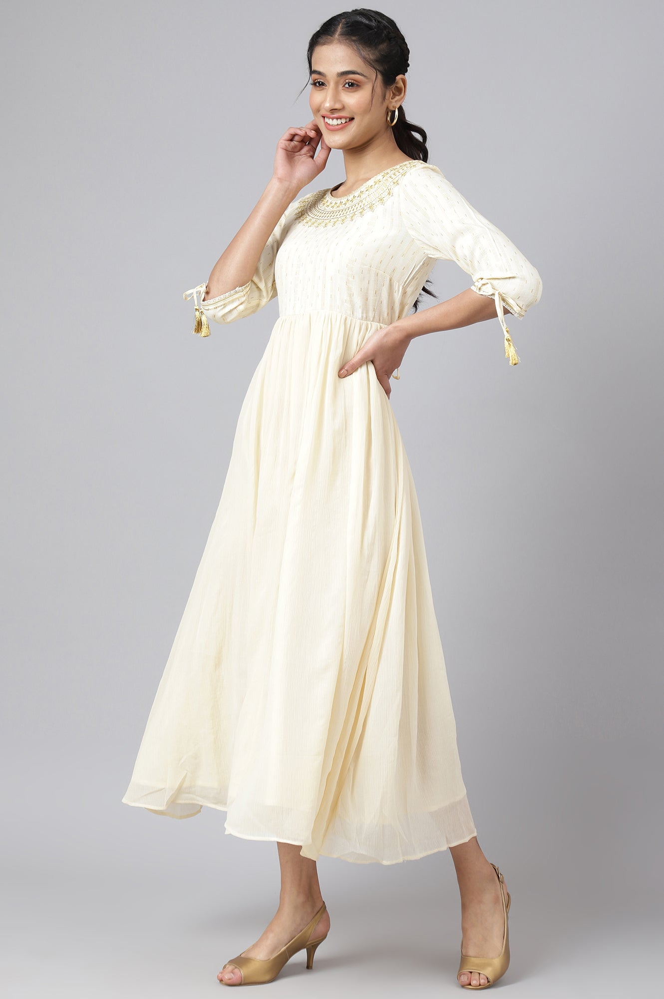 Anise Flower chiffon dress embellished with ornate gold embroidery on neck, is sure to make you feel an indian princess fantasy. This dress has tie up sleeve detail with gold tassels. You can wear it as it is or pair it with our classic gold woven dupatta.