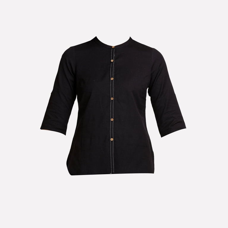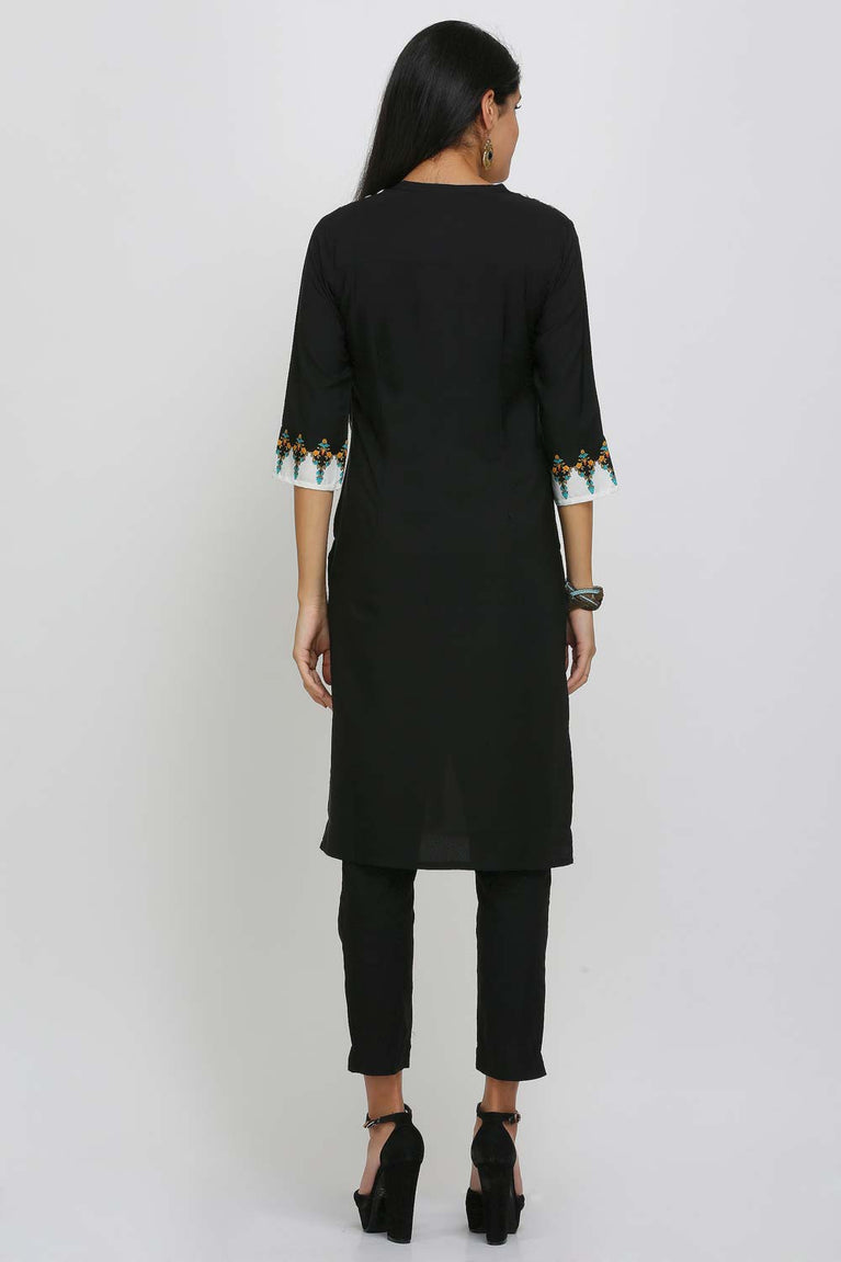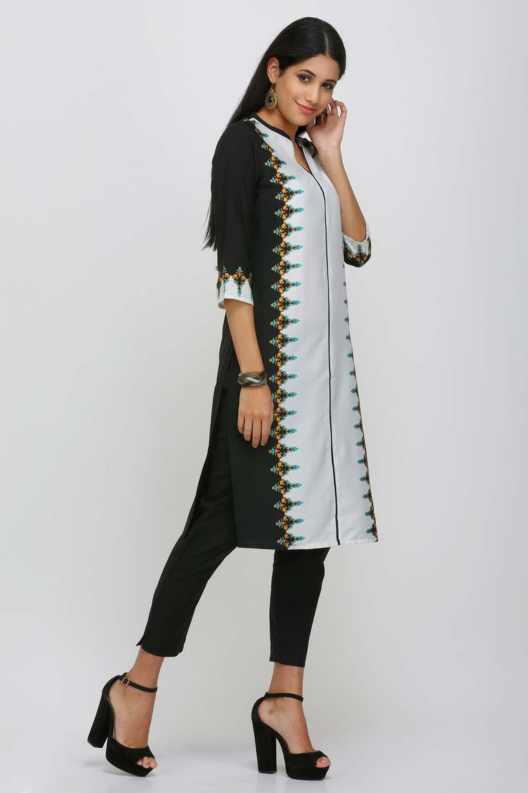 A fresh, monochromatic floral kantha printed straight kurta with smart mandrin neckline detail with placket highlighted contrast piping. This gives you a space to choose from variety of bottoms in contrast.