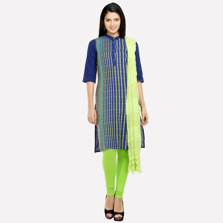 Make the statement look in this festive season with this beautiful beige coloured printed straight kurta. It is paired with blue tights and organza dupatta.