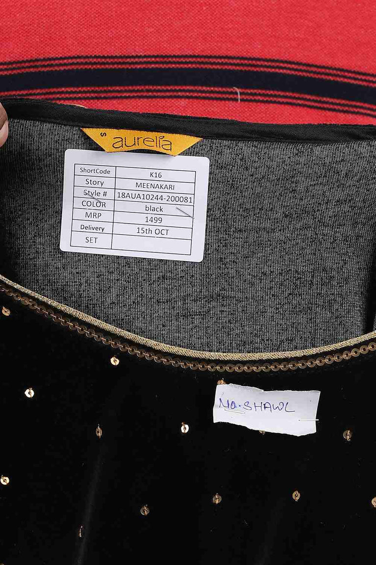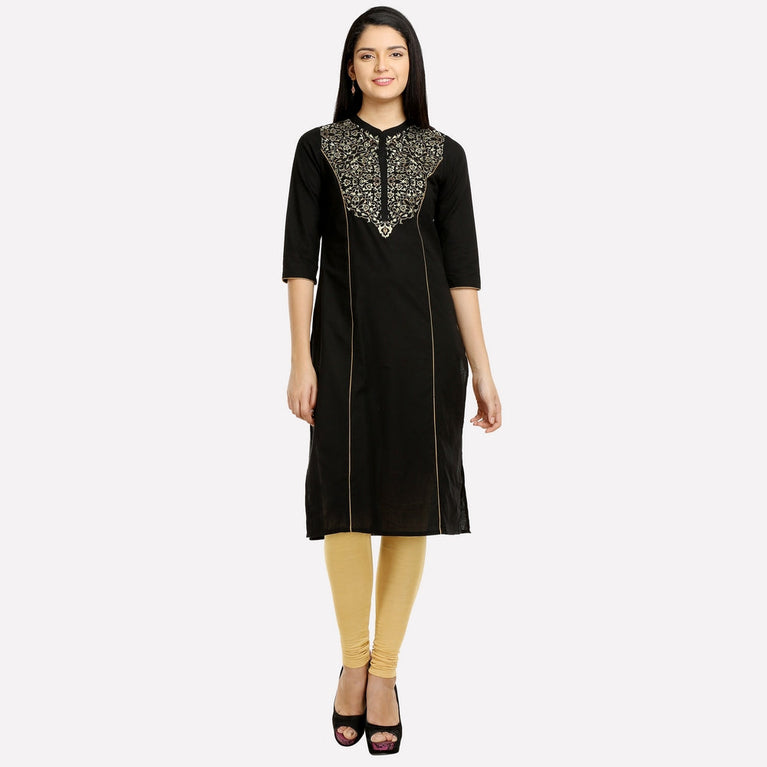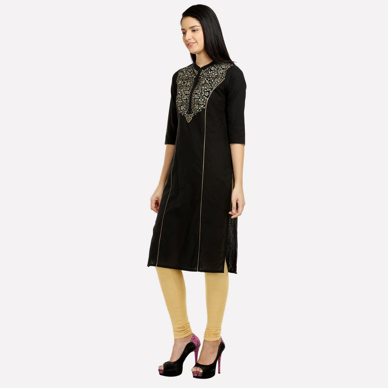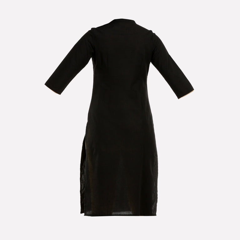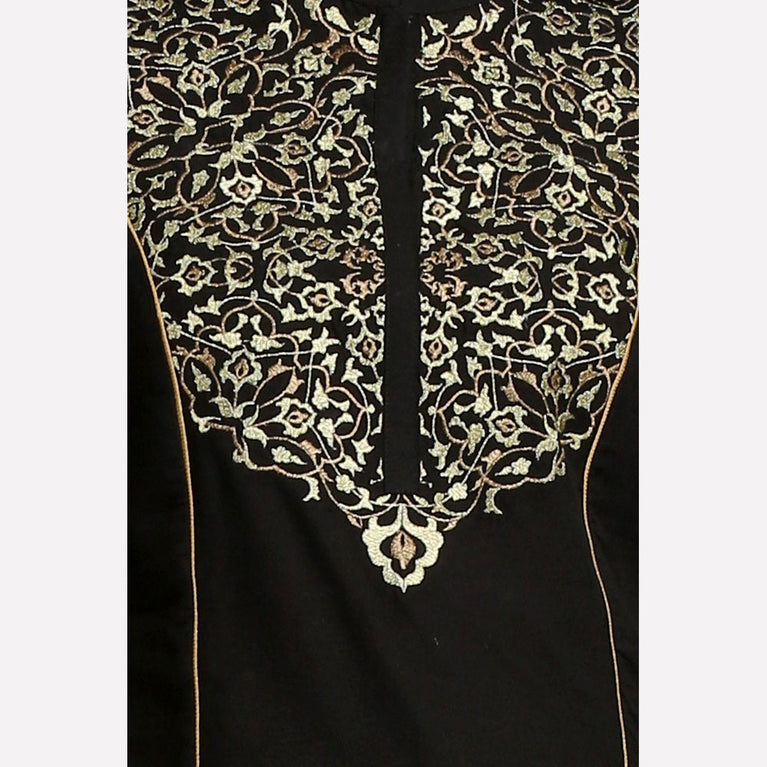 You can never go wrong with this interesting black and golden kurta set. Get ready for festive look with this straight silhouette printed kurta, it features embellished neckline. The kurta is paired with golden tights and dupatta.