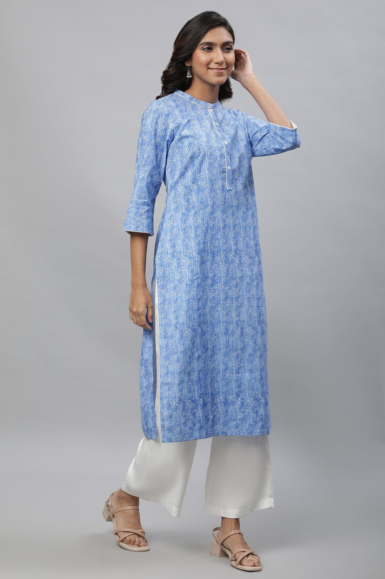 This straight kurta in a blue batik print is a versatile addition to your everyday wardrobe. Crafted from soft, breathable cotton, it features a classic round neckline and a relaxed silhouette, making it perfect for day-to-day outings with comfort and style.