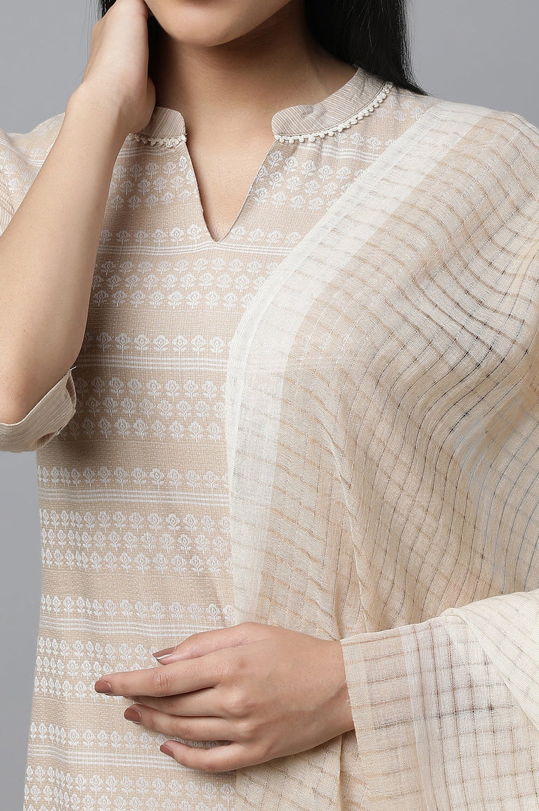 Beige Printed Festive Kurta, Tights and Dupatta Set