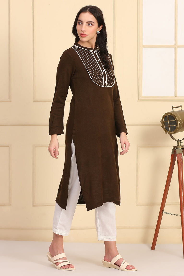 Brown Solid Embroidered Yoke Straight Winter Kurta