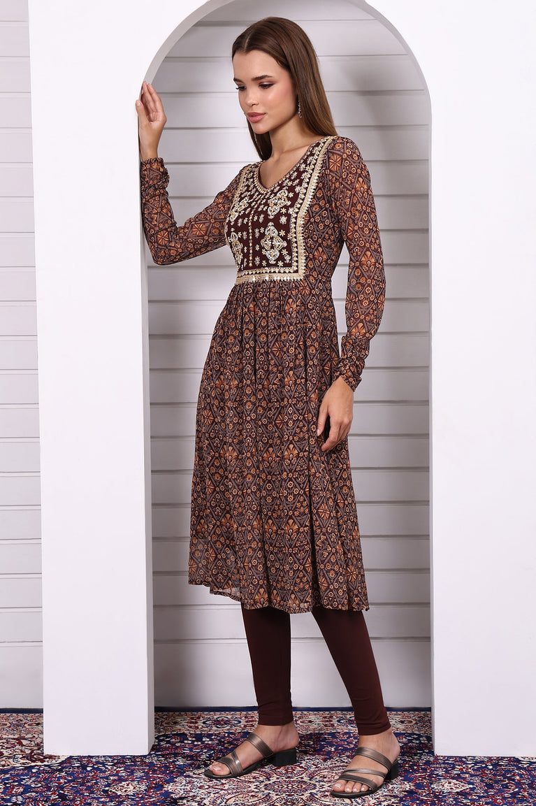 Brown Geometric Printed Zari Embroidered Georgette A-line Kurta, Leggings and Dupatta Set