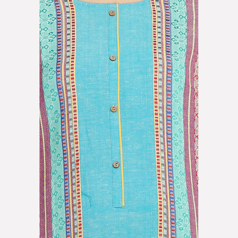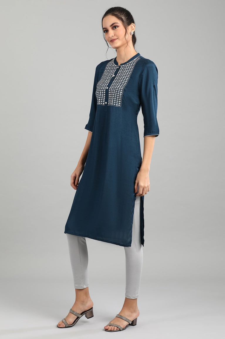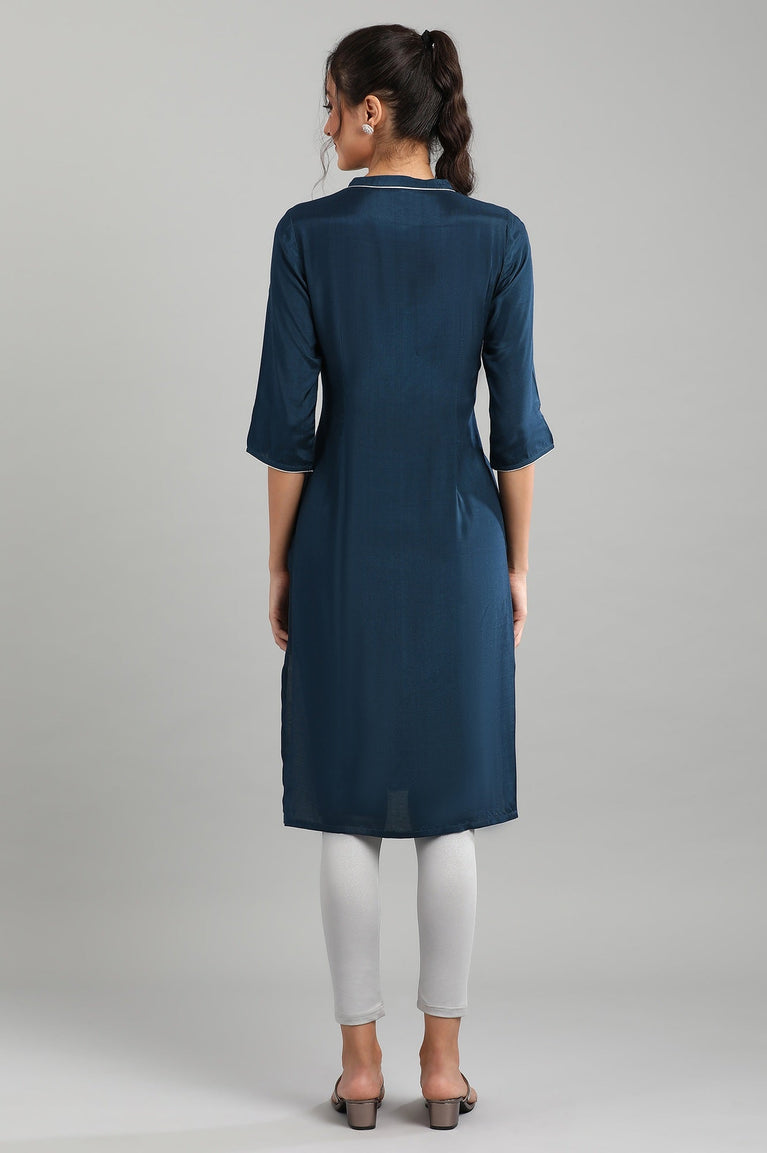 This blue mandarin neck 3/4 sleeve kurta has button placket on the front, printed detail and side slits.