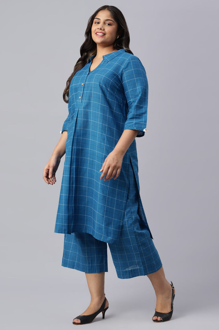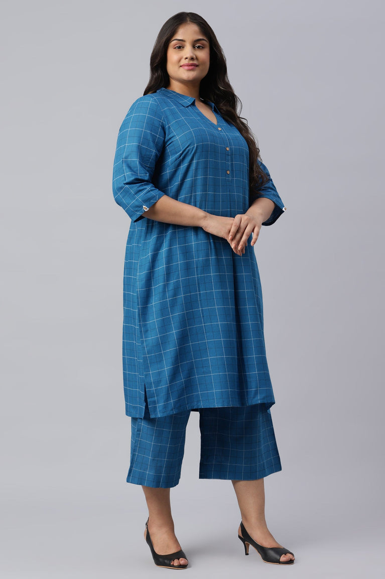 Blue Check Print Shirt Collar Plus Size kurta
