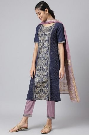Blue Glitter Printed kurta with Purple Trousers and Dupatta
