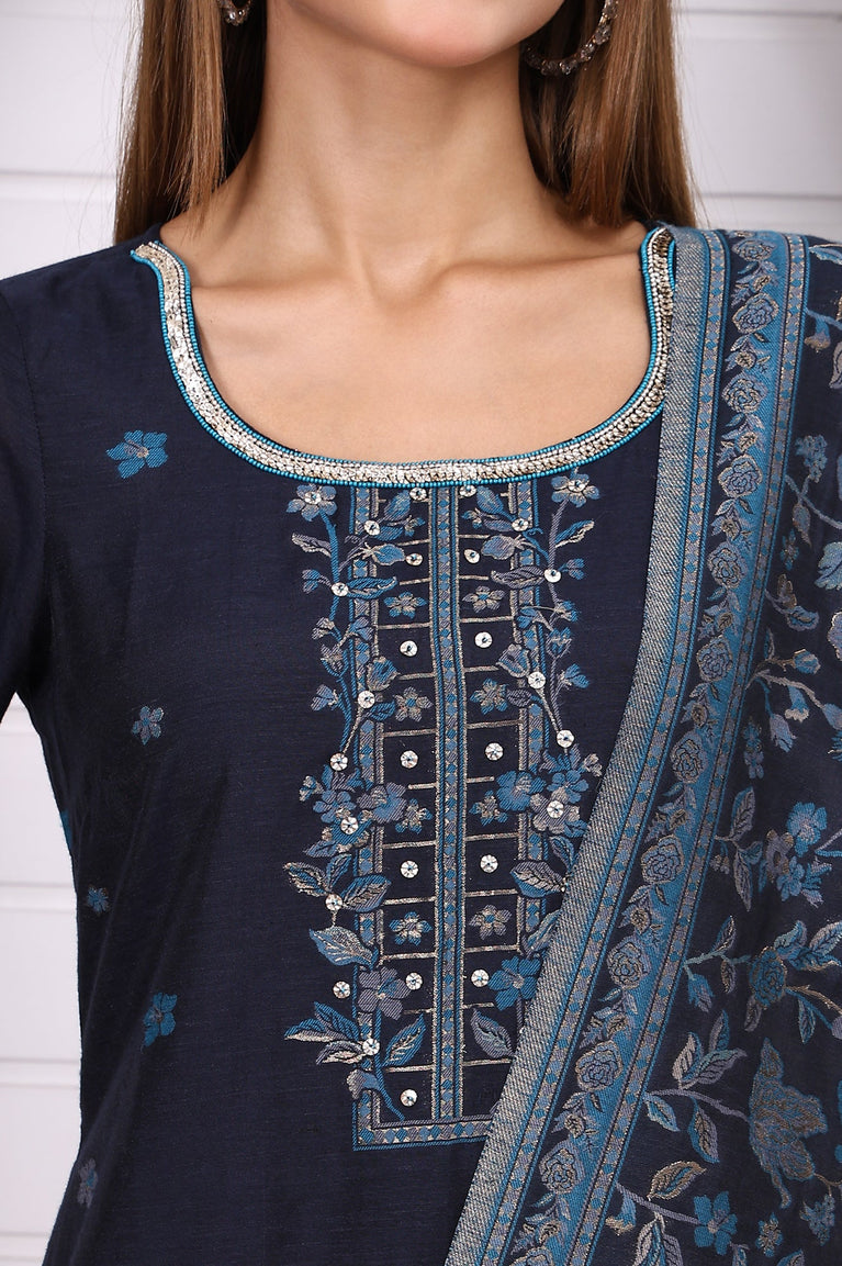 Blue Ethnic Motifs Printed Hand Work Jacquard Straight Kurta, Palazzo and Dupatta Set