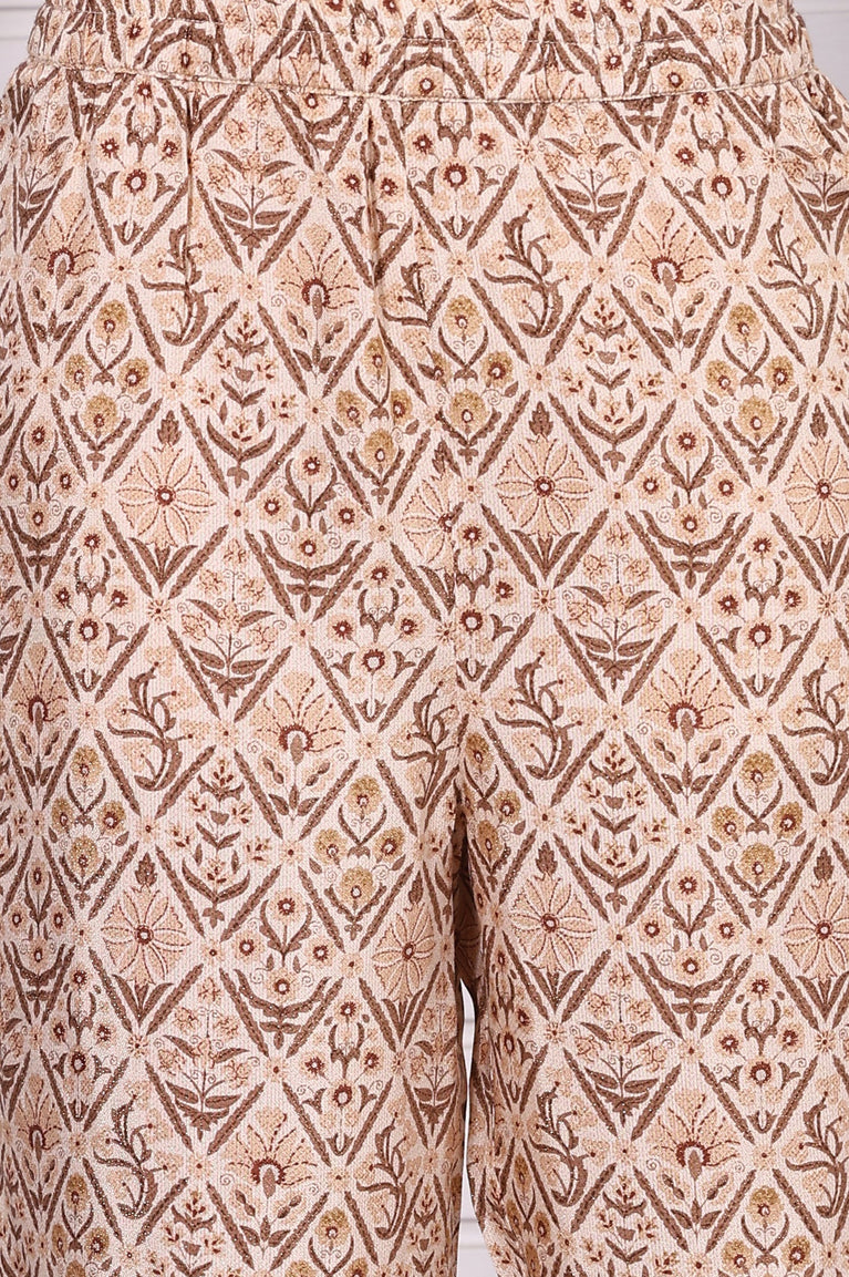 Beige Abstract Printed Beaded Cotton Straight Kurta, Palazzo and Dupatta Set