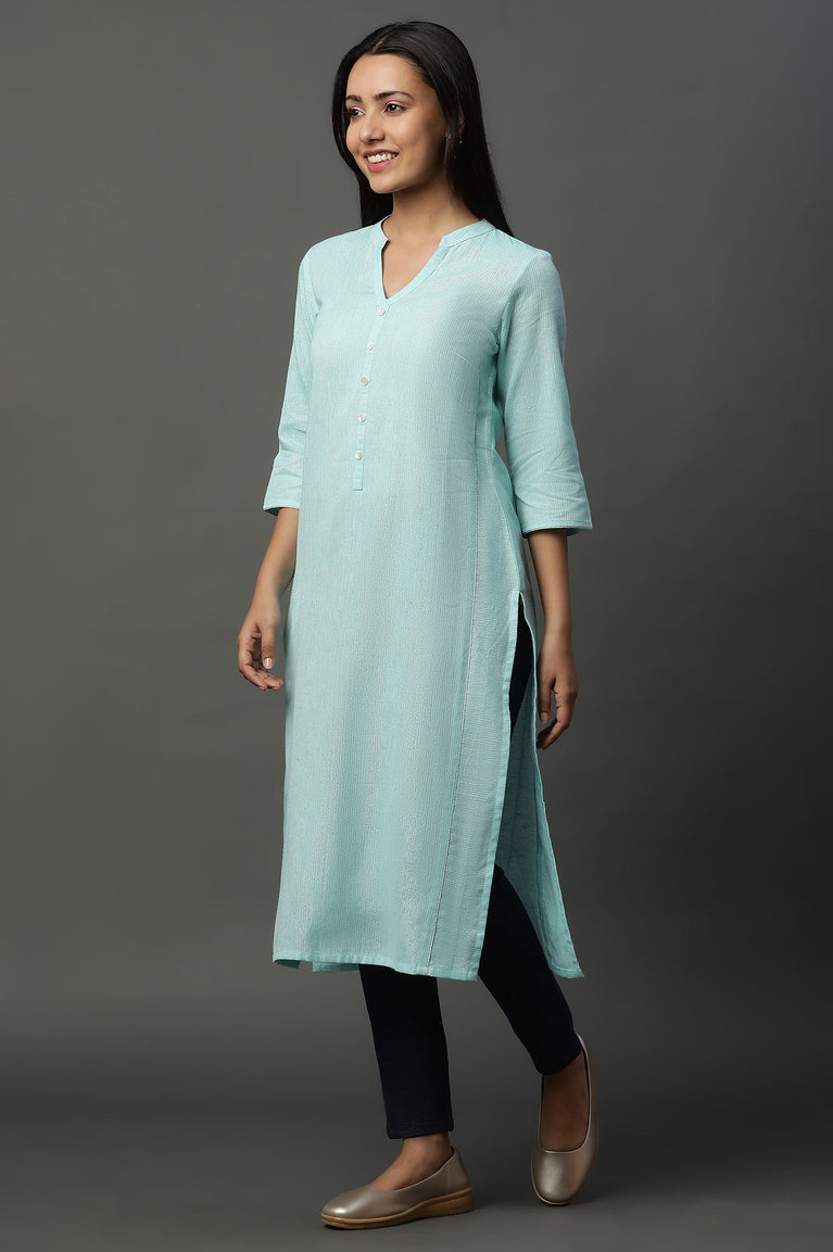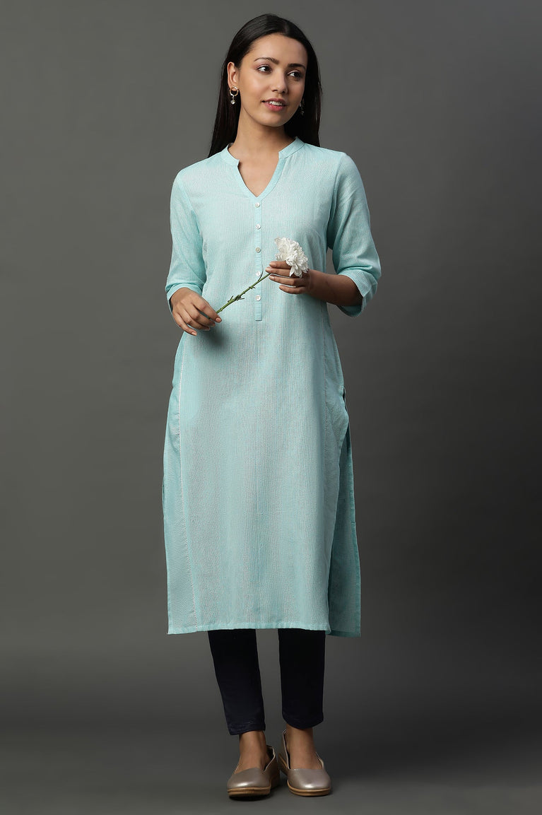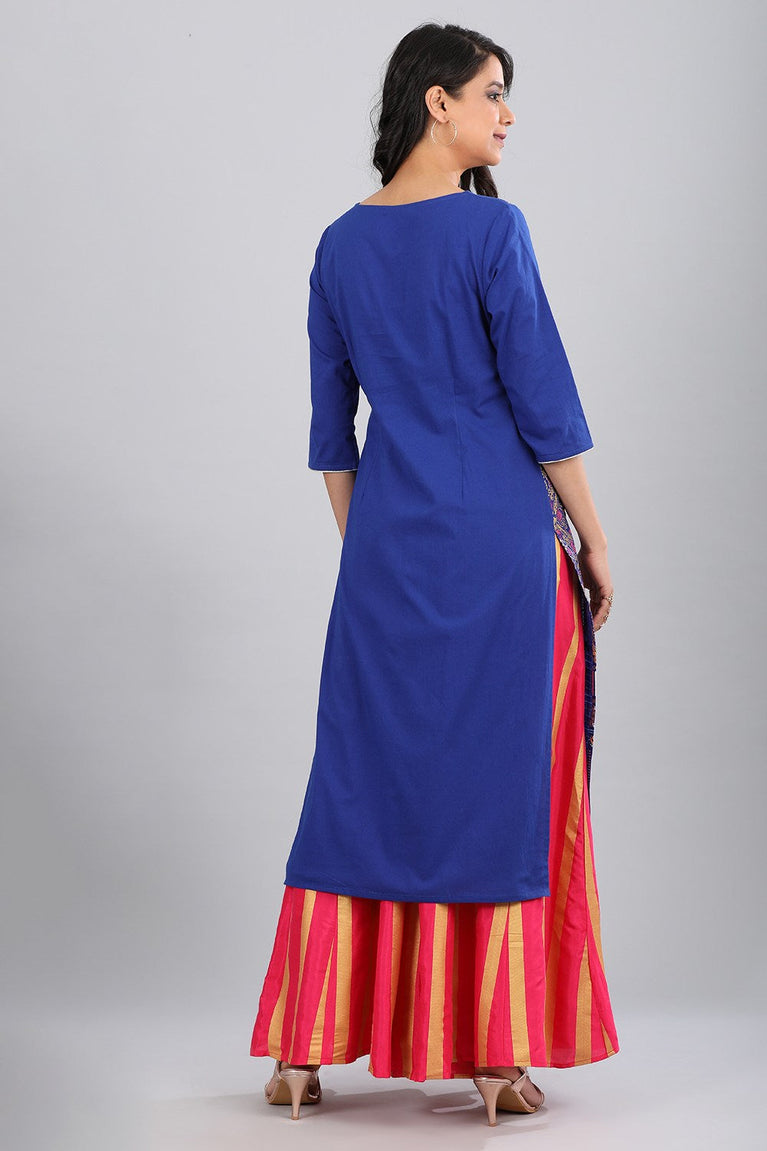 Blue round neck 3/4 sleeve kurta with printed detail.