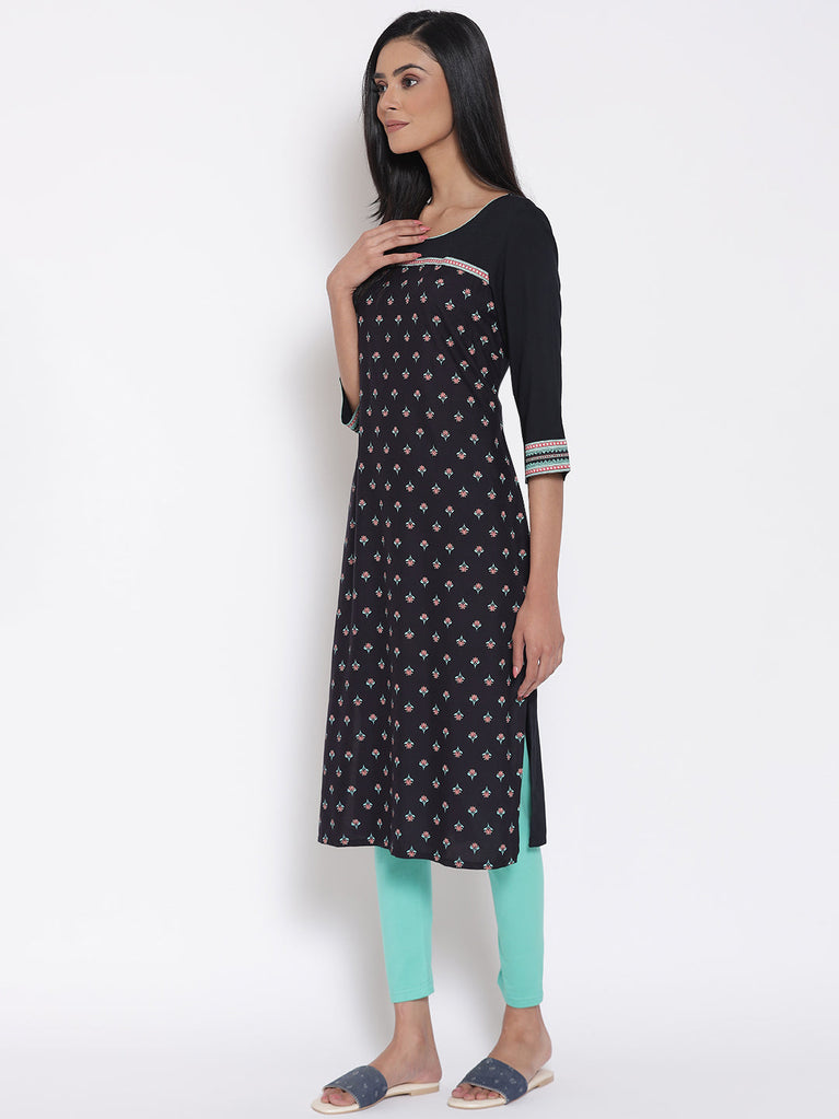 Get ready to make statement look in this casual LIVA kurta set. The set has black printed straight kurta in round neck and it is paired with skin fit tights.