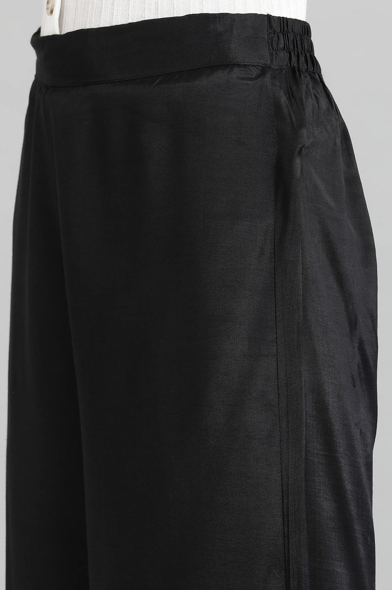 Black solid kurta in round neck a with zari embroidery, paired with flared solid palazzo pants in mid-rise and elasticated waistband.