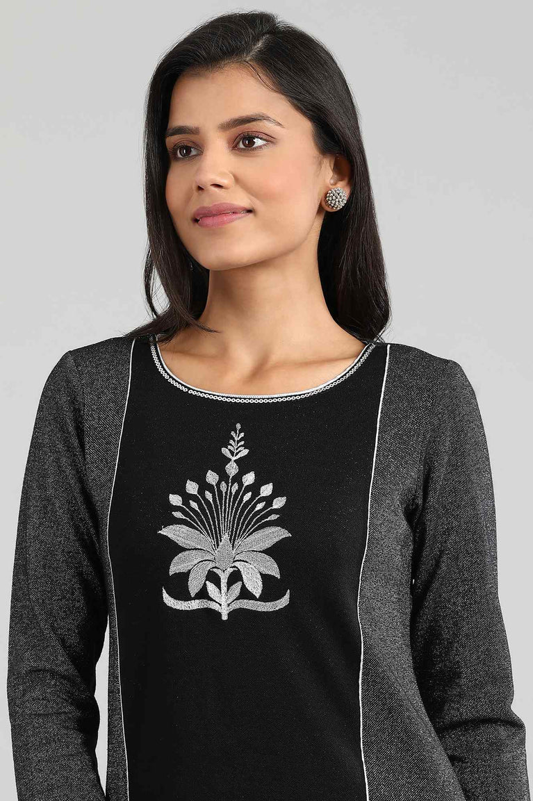 Black round neck full sleeve knitted kurta with zari embroidery detail and side slits.