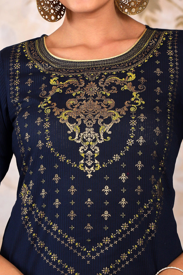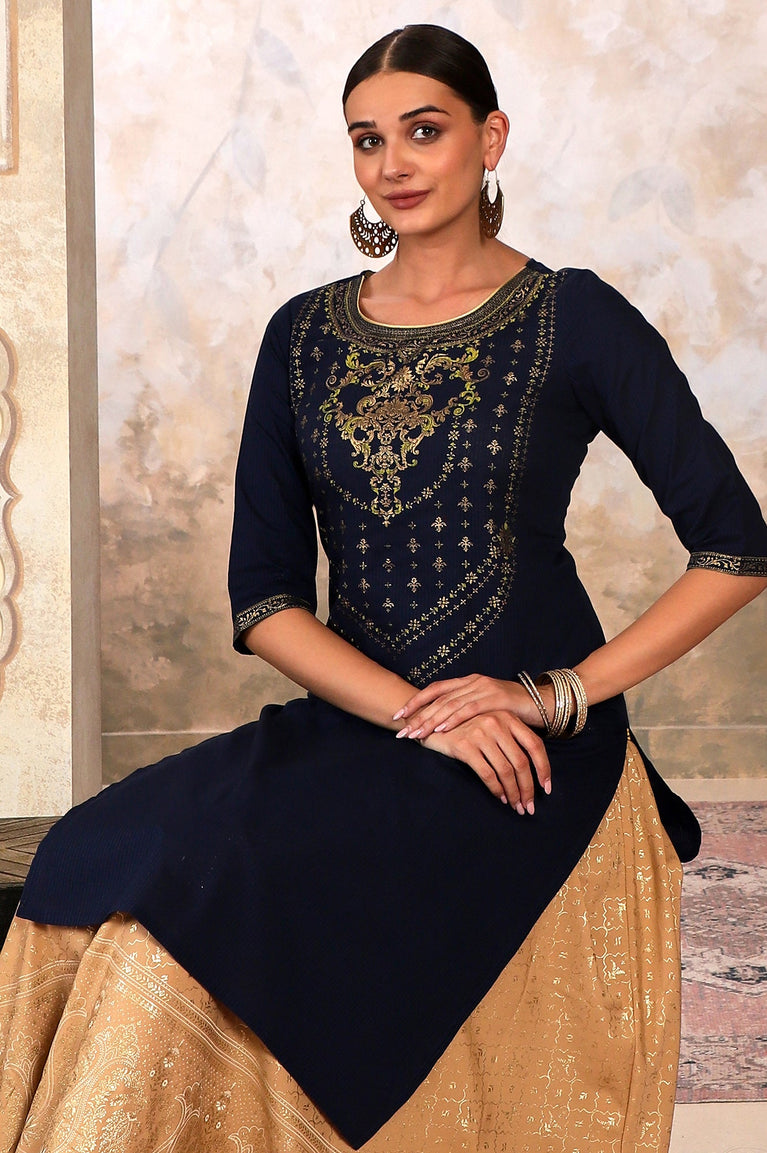 Blue Yoke Foil Printed Festive Kurta