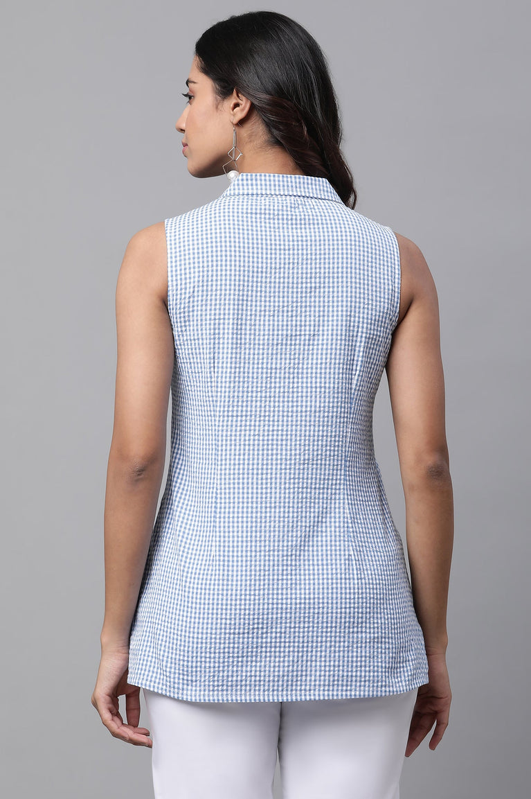 Accentuate your everyday look with this textured seer sucker fabric short kurti. It has been elevated with checks play on side panel which gives this a very fresh look. This Aurelia top-wear is highlighted with shirt collor and sleeveless style.