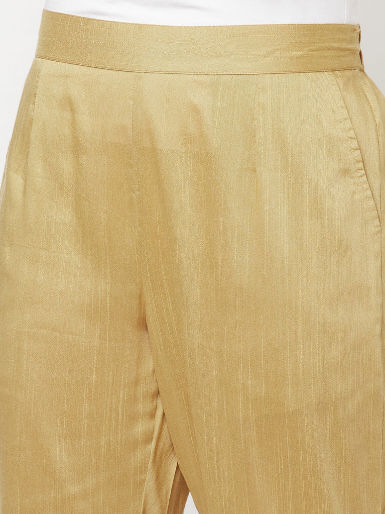 Exclusive festive colour for your special occasion. This heavy gold printed yoke kurta with similar printed patch border on sleeve opening is a must-have for this festive season. It comes in round neckline and straight silhouette.
