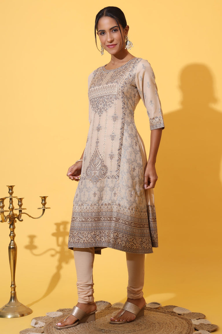 Embrace refined elegance with this beige panelled kurta set, crafted in breathable linen fabric. Featuring delicate embroidery around the neckline and a beautifully designed jacquard dupatta, this ethnic ensemble blends timeless style with everyday comfort. The soft, soothing color palette adds a graceful charm, making it perfect for festive wear, office attire, or family gatherings. This all-in-one ethnic outfit is designed to make you feel effortlessly stylish.