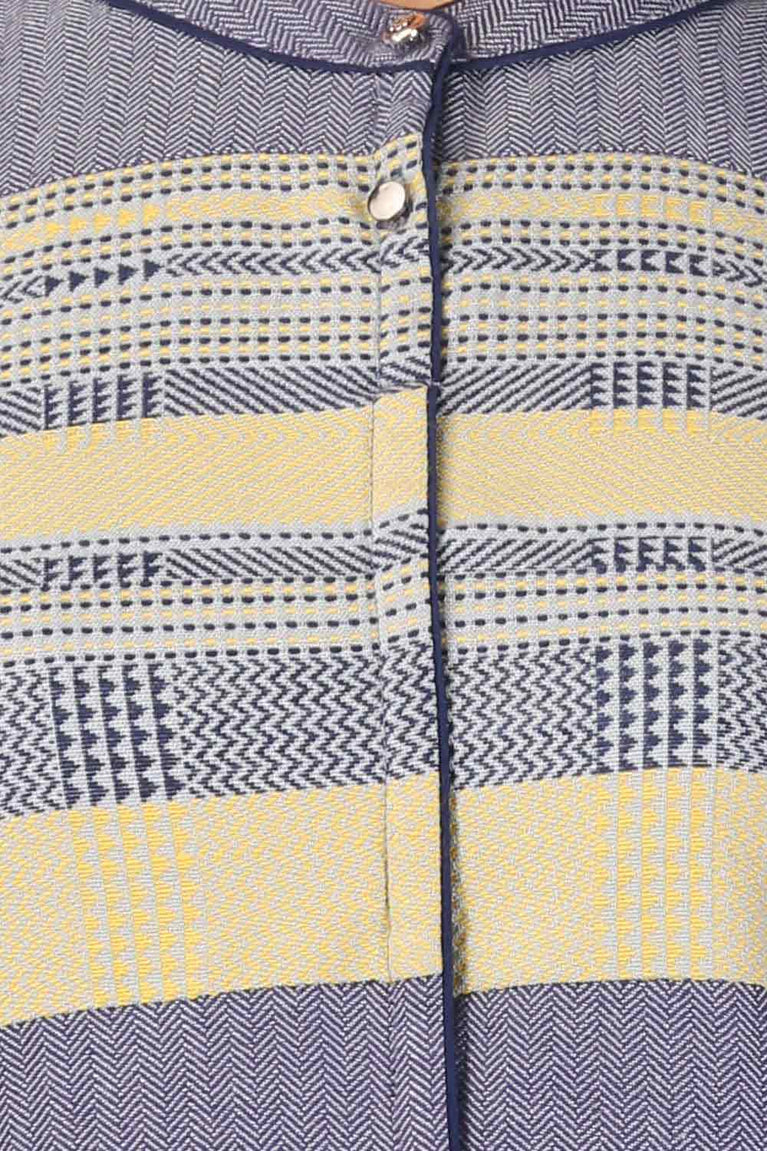 Light festive indian ethnic dress in sodalite blue colour is embellished with foil print and have border on hem and sleeves. It has mandarin collar with button closure.