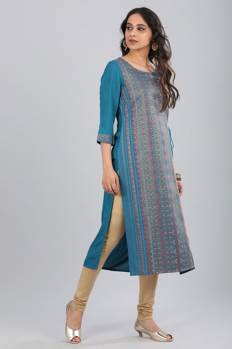 Hydro blue ethnic kurta, flattering floral print and has U-neck. The kurta has straight silhouette and side slits.