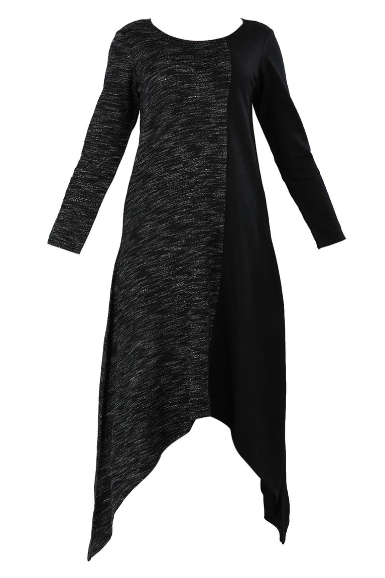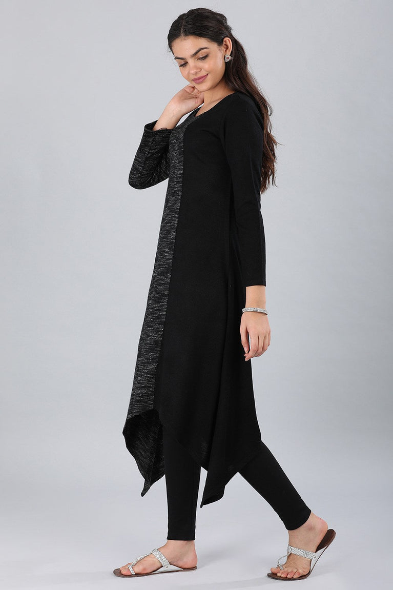 Black round neck yarn-dyed kurta with asymmetrical hemline.
