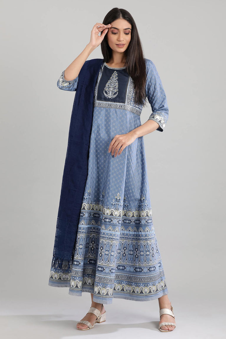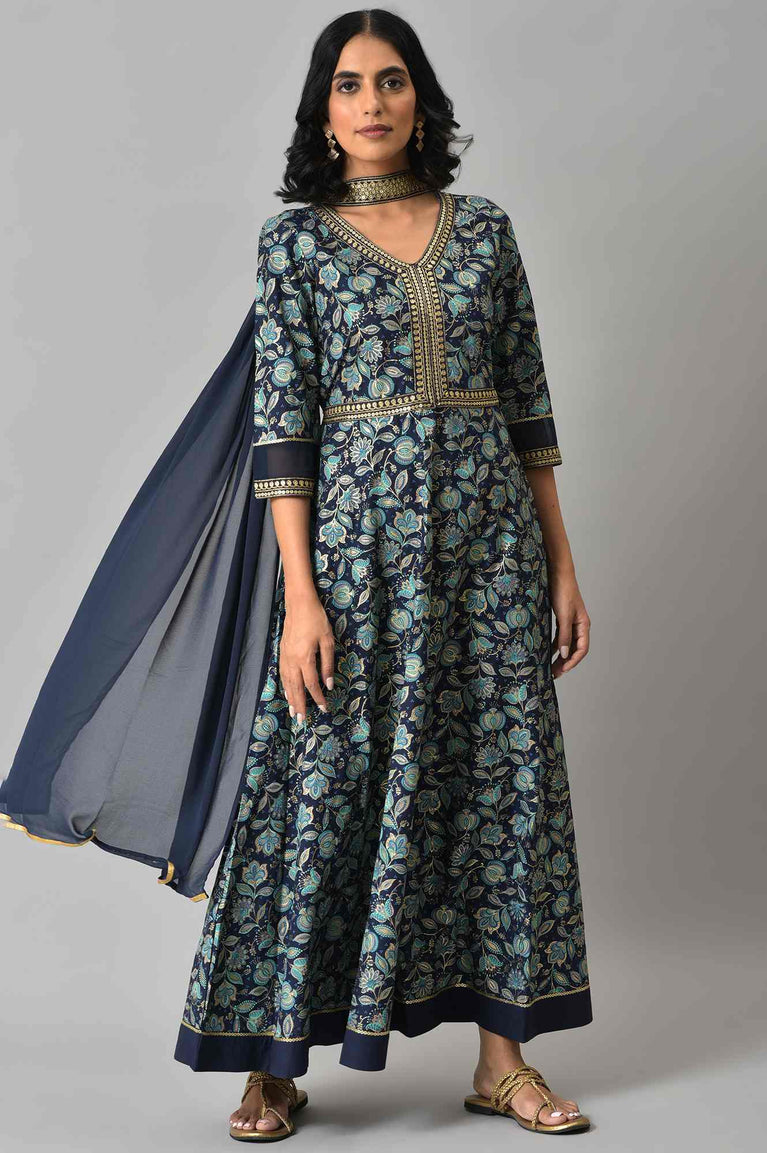 Blue Floral Printed with Zari Embroidery Liva Dress and Dupatta Set