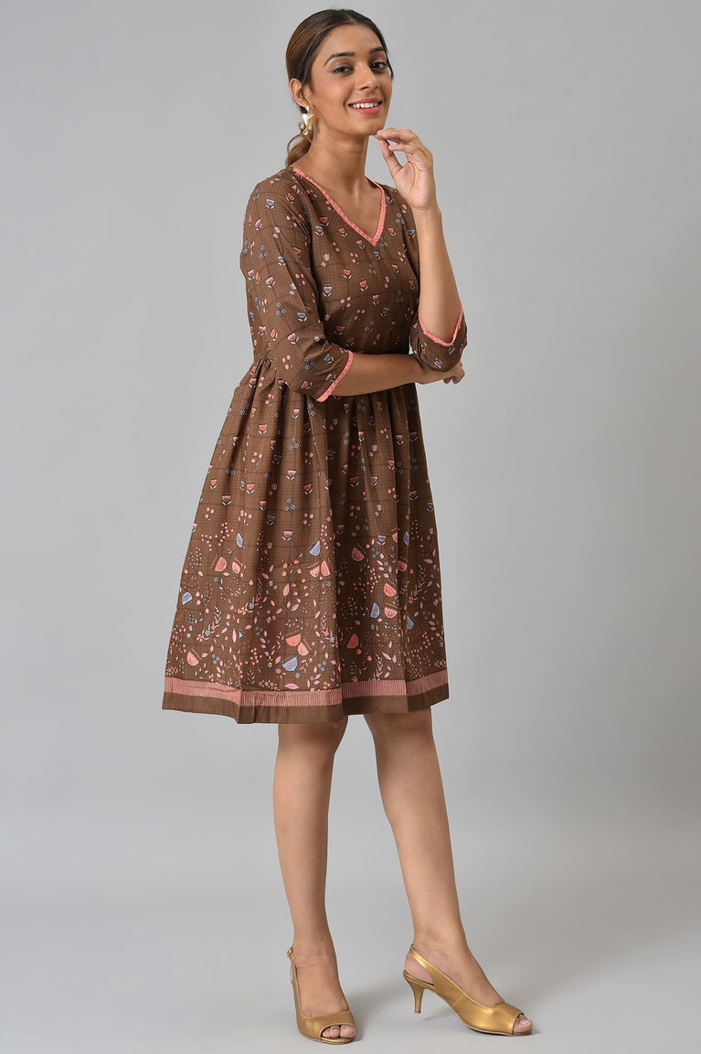 Brown Floral Printed Flared Dress