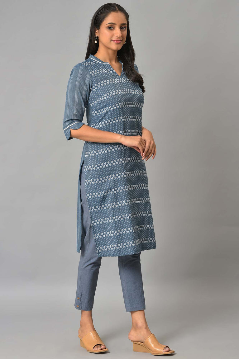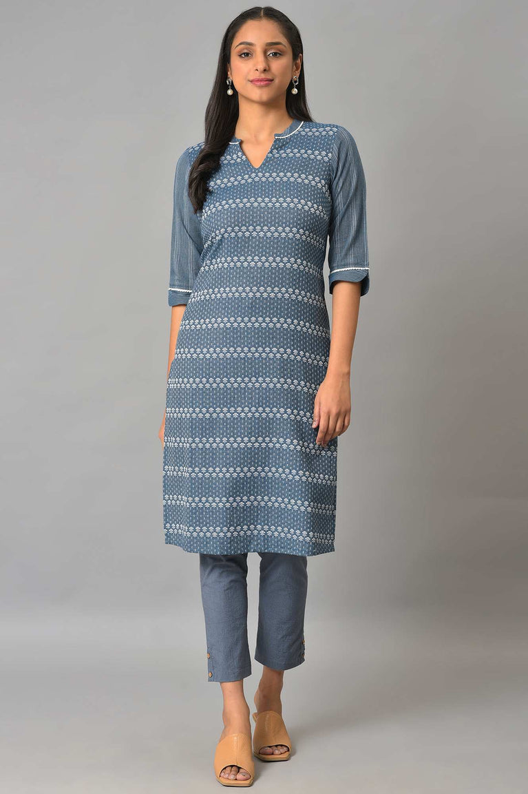 Blue mandarin neck kurta with printed detail and placket on the front.