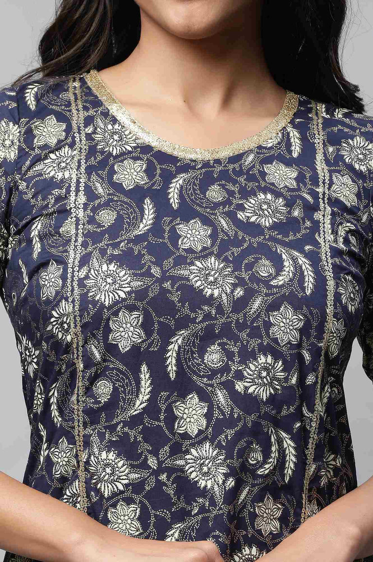 Blue Floral Printed Kurta with Zari Embroidery