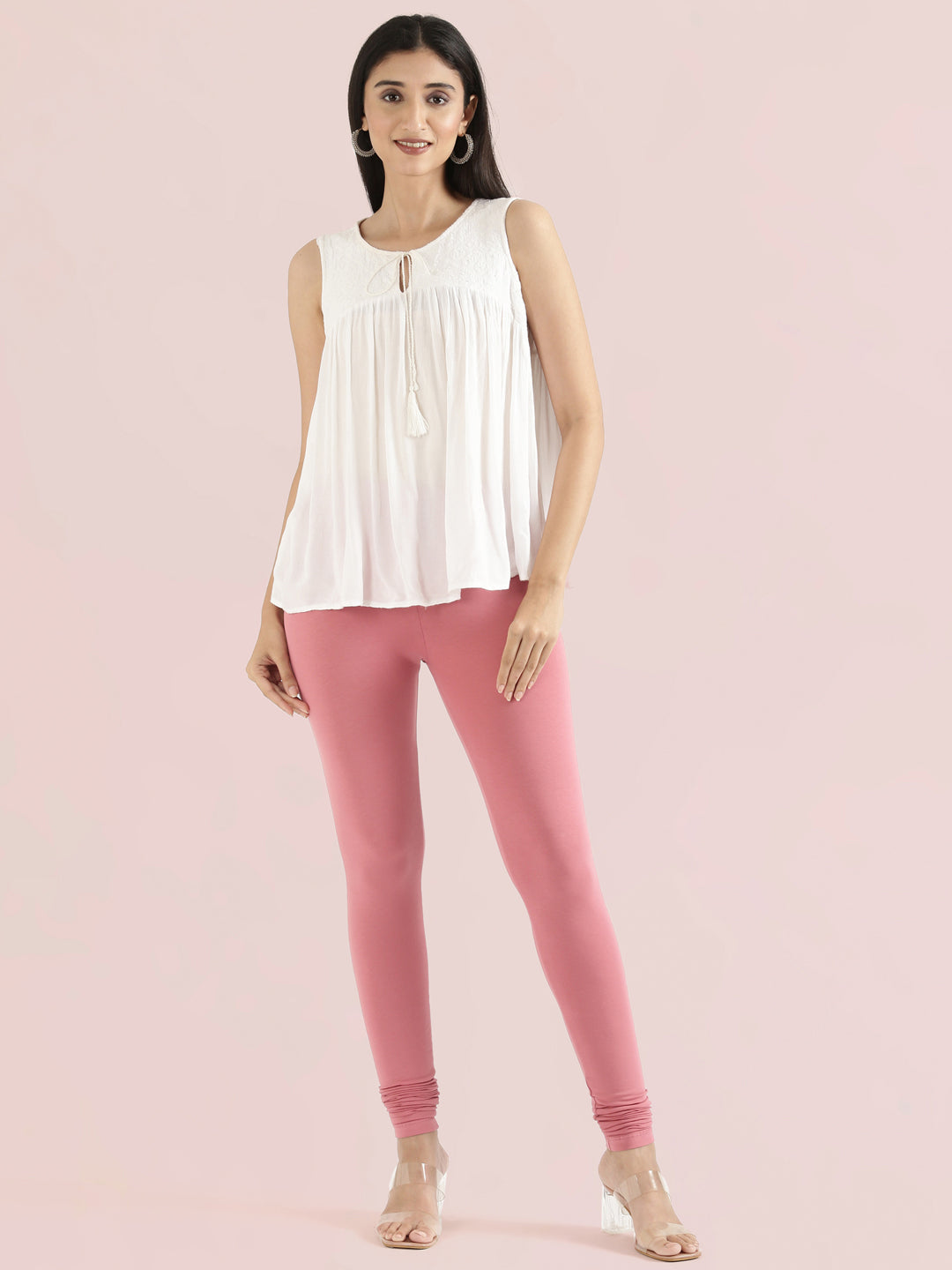 Go chic with a pair of Blush Pink Solid Churidar Leggings. Made from high quality cotton, it has a elasticised waistband & gathers at the hemline