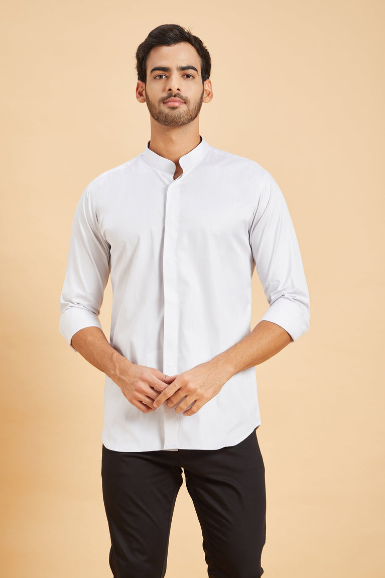 Description:This grey shirt with chinese collar is perfect for a classy yet stylish look.The concealed lapel gives it a unique edge that will stand out from the rest. Pair it with your favorite jeans or trousers for a casual and formal look. Made with high quality fabric, this shirt will keep you comfortable all day long.