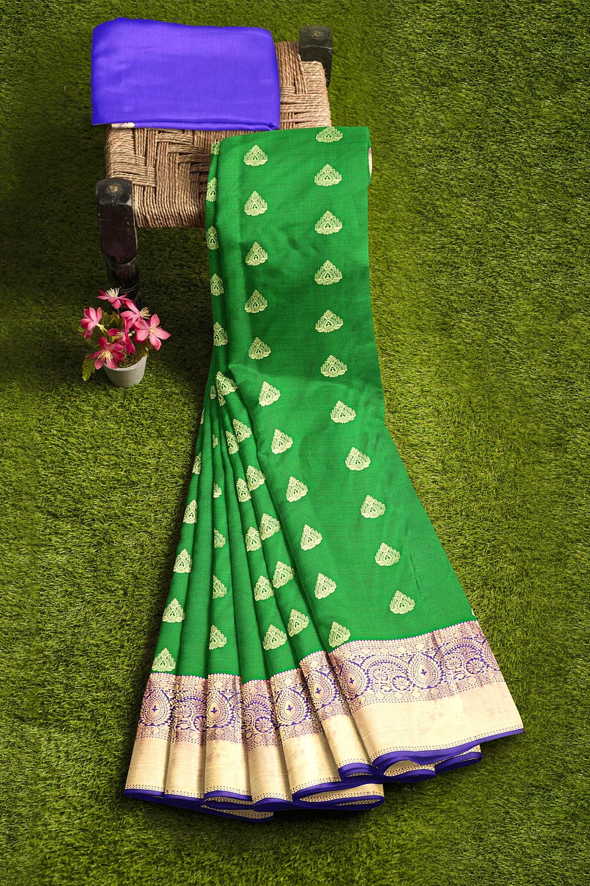 Latest GREEN BUTTIS SILK BLEND Saree with CONTRAST ZARI border. This saree comes with PLAIN WITH BORDER SILK BLEND blouse.