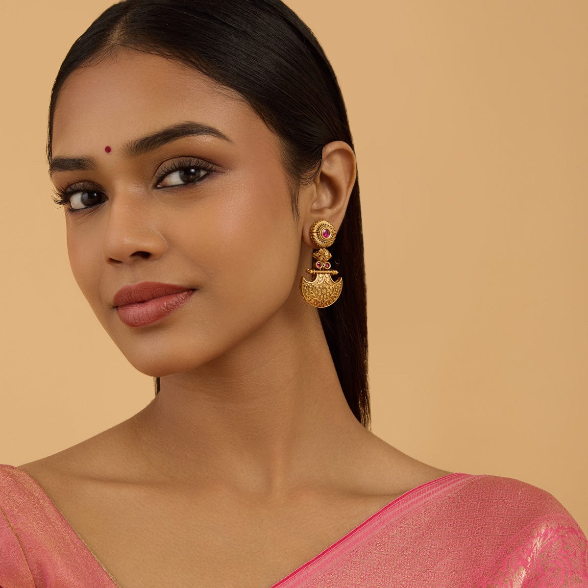 Glam up instantly with these stunning antique earrings from Kushal's Fashion Jewellery, a stunning blend of elegance and tradition. With radiant ruby stones and a luxurious gold polish, these hanging earrings are designed to dazzle. Lightweight and featuring a convenient push-back closure, they're perfect for any occasion.