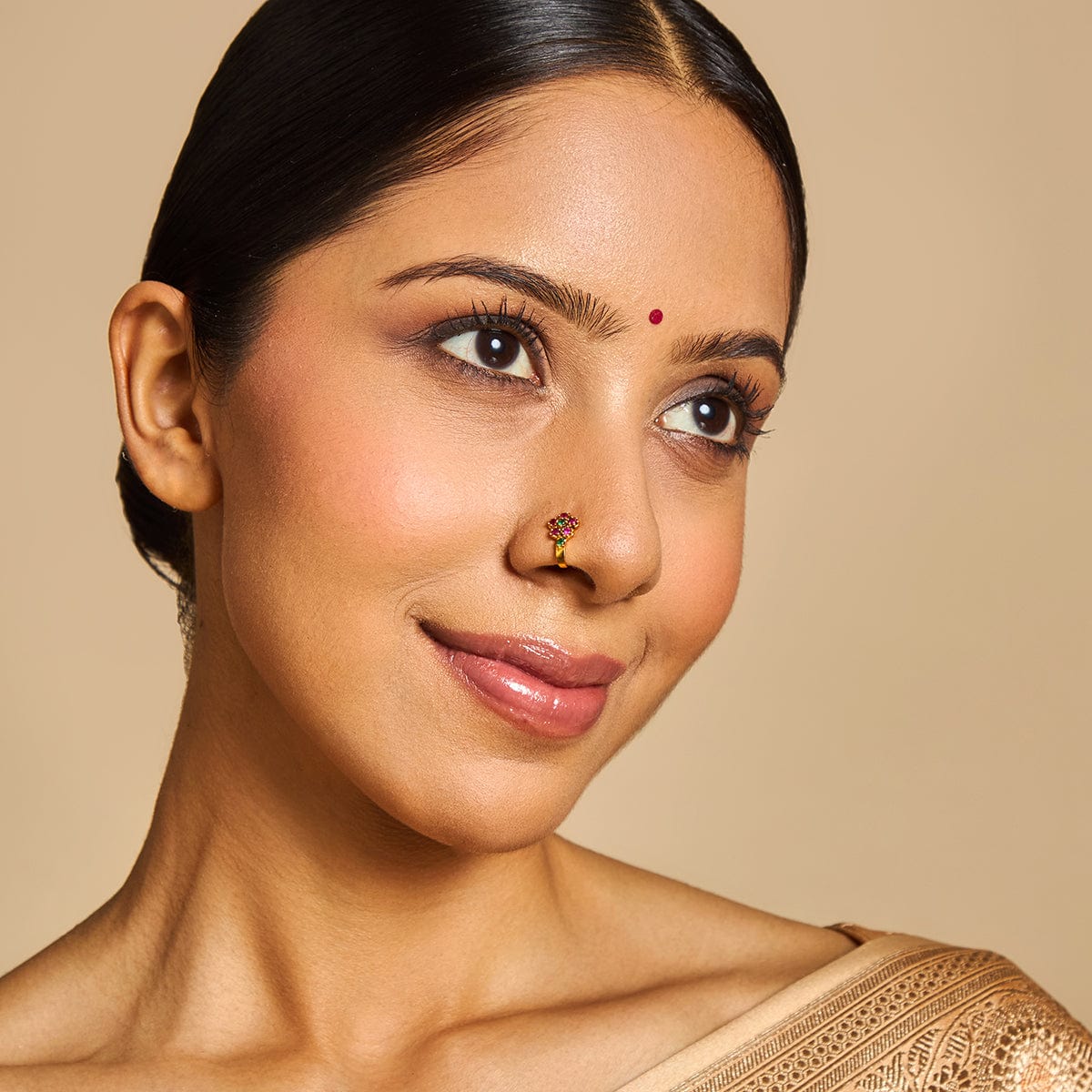 Flower Motif Antique NathGet ready to make a statement with this antique nath from Kushal's Antique Jewellery Collection. Crafted from a lightweight copper alloy base, it adds a touch of vintage charm to your look. It is available in three colour options: ruby, ruby-green and white. For a complete look, pair it with a dhoti-kurti set.
