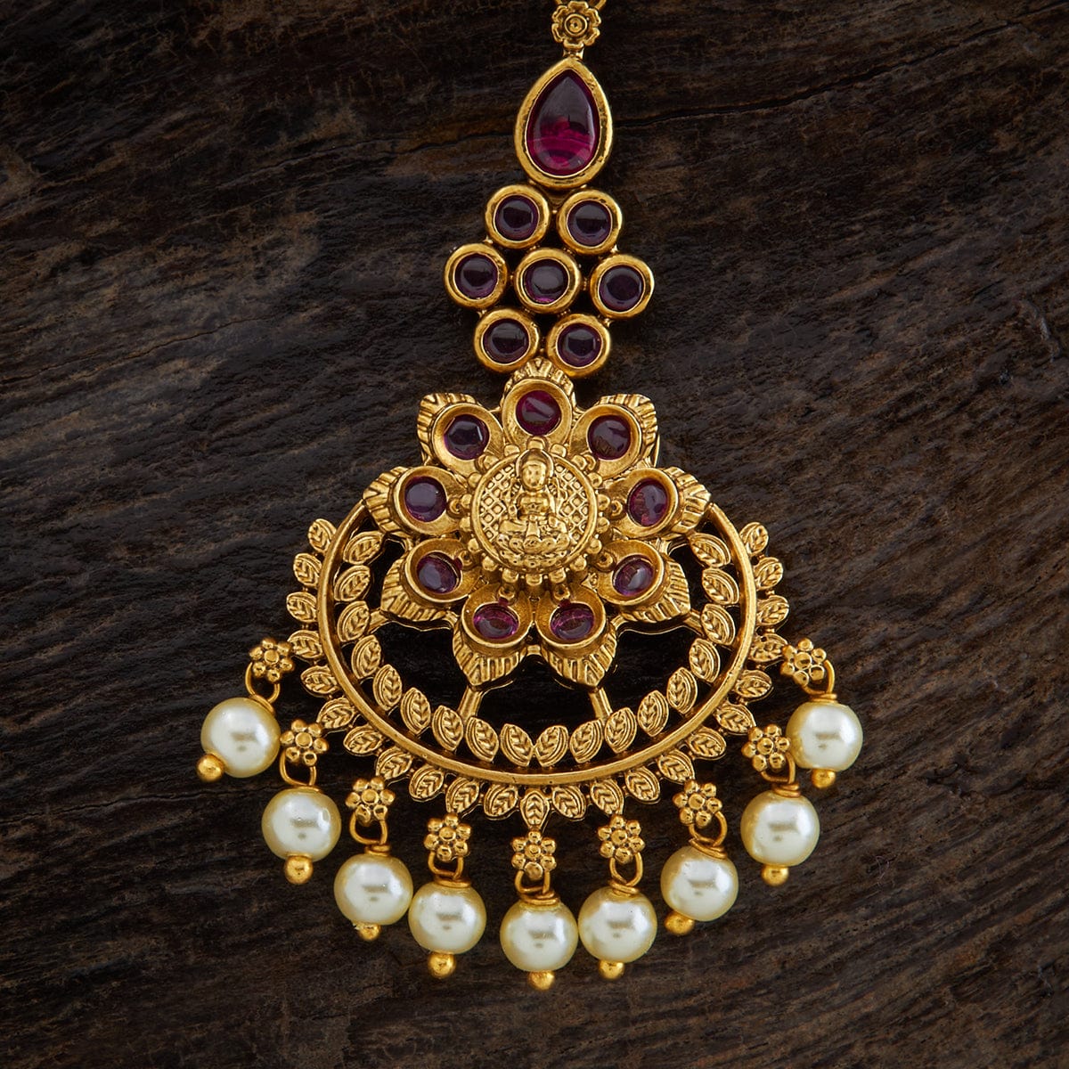 Looking for some beautiful hair accessories for a traditional event? This antique Tikka is a perfect piece to add to your traditional look. The floral carving and tiny leaf design embellished with Ruby stones and hanging pearls are alluring enough for a stunning presence. Style it with loose hair or any other hairstyle and impress everyone on this festive occasion.