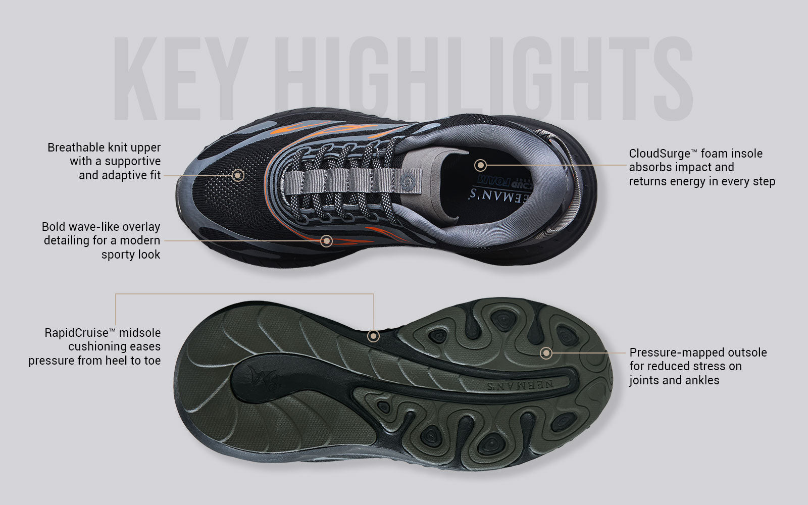 Walk? Sure. But these were made to do much more. With dual-tech RapidCruise™ & CloudSurge™ cushioning, pressure-mapped sole, and bold details that add a sporty edge to every step, the Begin Walk Flames are your daily ignition switch. Comfort’s just the base here! The real superpower is the energy they add to your stride.