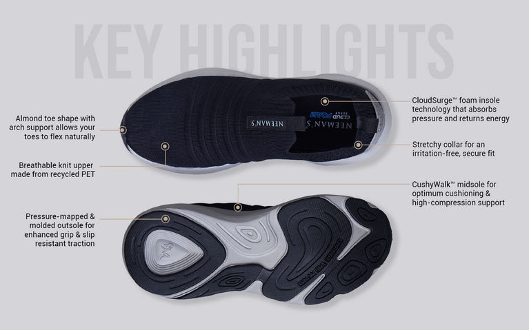 With the dual tech cushioning of our CushyWalk™ midsole and CloudSurge™ foam insole, Begin Walk Ease absorbs pressure and returns energy, adding a bounce to your steps to take on the day’s hustle. Its adaptive performance knit design hugs your feet snugly while keeping them breezy & cool and a pressure-mapped outsole reduces stress on your joints & ankles. This is minimal, with all heart.