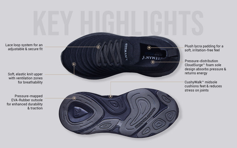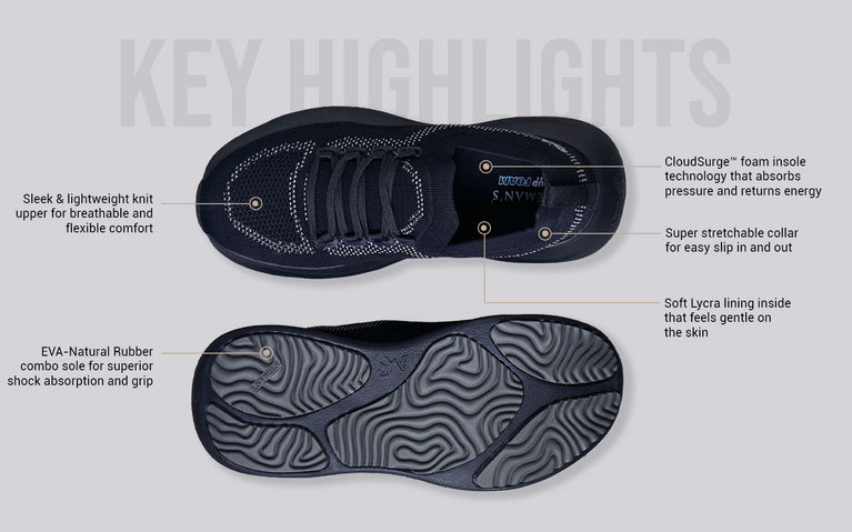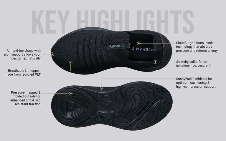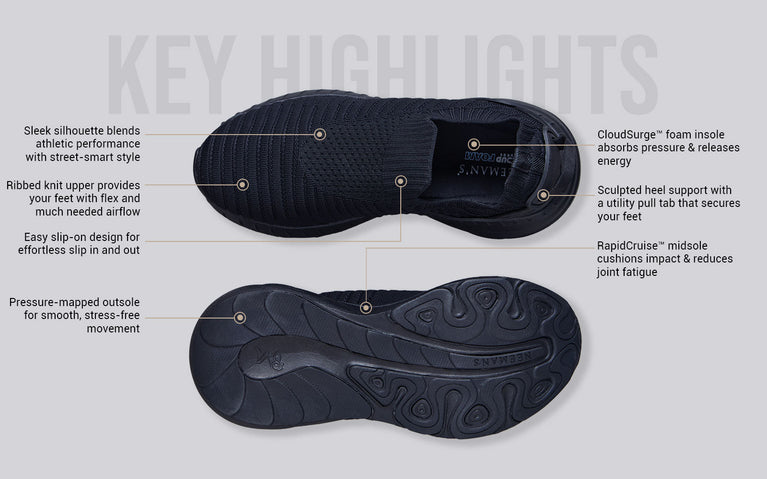 With the dual tech cushioning of our CushyWalk™ midsole and CloudSurge™ foam insole, Begin Walk Ease absorbs pressure and returns energy, adding a bounce to your steps to take on the day’s hustle. Its adaptive performance knit design hugs your feet snugly while keeping them breezy & cool and a pressure-mapped outsole reduces stress on your joints & ankles. This is minimal, with all heart.