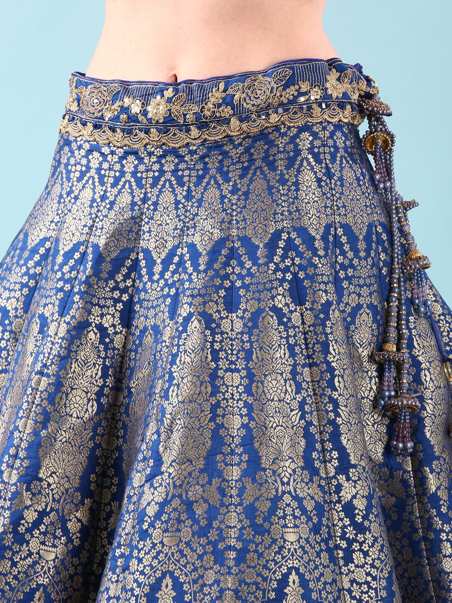 Embrace timeless elegance with this stunning blue silk ghagra set, meticulously crafted with intricate hand embroidery. The rich blue hue complements traditional artistry, while the flowing silhouette offers graceful movement and comfort. Perfect for weddings, festivals, and special celebrations, this ensemble showcases the finest in ethnic craftsmanship. Each stitch tells a story of dedication and skill, making it a cherished addition to your wardrobe.