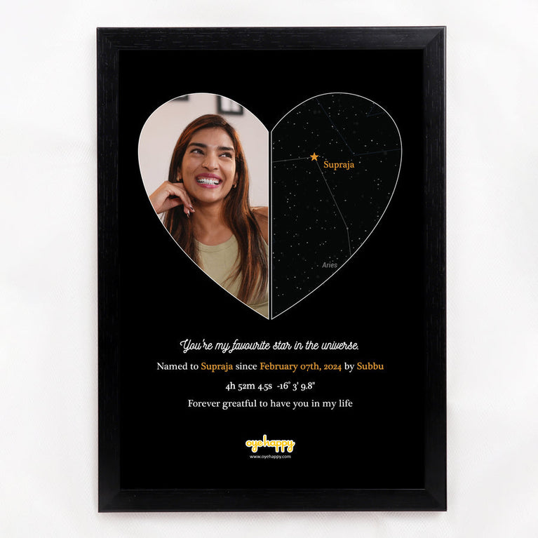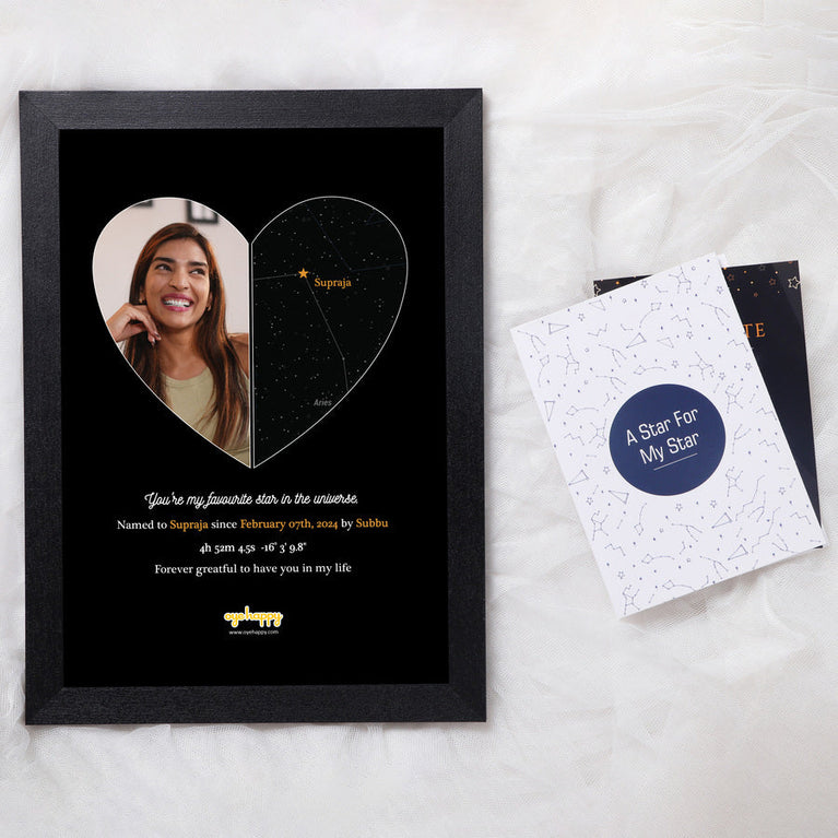 Specifications: Size of the frame: 13.2 x 9.9 inches. Oye Happy is a verified facilitator between the naming service and the customer. The company, GiftYourStar, is an Accredited Registrar of the Star Dedication Archives.The star can only be booked for the current year, not for previous years. If you input the date of the occasion as 17/03/1987, the star will automatically be booked for the current year, regardless of the entered date.