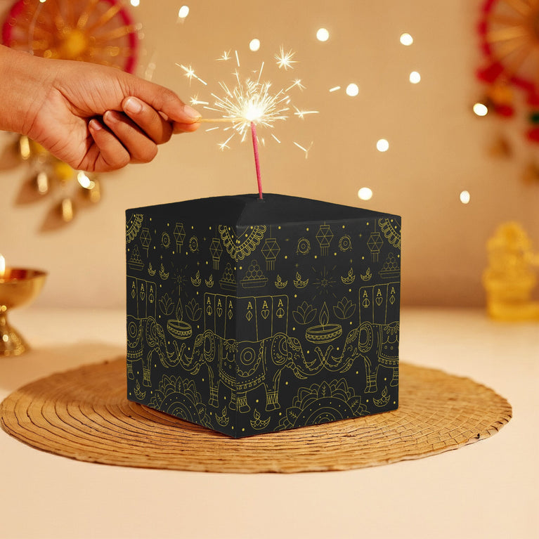 Introducing India’s First Patakha Box — a one-of-a-kind festive surprise that looks like a cracker but opens up as a magical hamper. It’s designed to give you the joy of lighting something special without any noise, or pollution.Celebrate Diwali with a thoughtfully curated hamper that includes:Gem Stone Tree Money stone Easel Spiritual Candle/leaf candle Diwali Greeting cardHow It Works :The Patakha Box is simple and safe to use:Light the wick or pull it gently.Watch the box unfold in a magical way.Experience the joy of festive unboxing with none of the mess or worry.Specifications-Size of the box: 14 cm X 14 cm X 14 cm