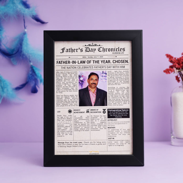 Your father-in-law opened his heart and home to you. Now it’s your turn to say thank you. Here is a sweet way to celebrate your father-in-law. This adorable hamper is filled with gratitude and love for the man who’s been your support system in your new home. The hamper includes:Father-in-law Chronicles - Make your father-in-law a celebrity with a personalized newspaper cover story celebrating his amazing qualities, interests, and nature. This fully customized gift includes a heartfelt message from you, a humorous weather report, an award section, and more. Mirror Card - Here’s a magical greeting card for your amazing father-in-law! This special greeting card is designed with a mirror attached so that when your father-in-law opens the card, he will see his face reflecting on it.Father-in-law Mug - Father-in-laws are the bonus fathers given to us. It's important to tell them how special they are. Here's a cute mug to express your gratitude and make your father-in-law smile everyday!Best Father-in-law Keychain - He may not have raised you, but he has always been there for you. This keychain is an adorable way to remind your father-in-law that he is just the best!Coasters for Dad - For the man who makes you feel like home, these cute coasters are a thoughtful little gift to a truly wonderful father-in-law.Specifications -Size of the Hamper Box : 25 x 10.5 x 19.5 cm Size of the Mirror Card : 12.5 x 17.7 cmsCapacity of the Mug : 330mlSize of the Chronicle Frame : 18.7 x 13.7 cmsSize of the Keychain : 5 x 5 cmsSize of the Coasters : 10.1 x 10.1 cms
