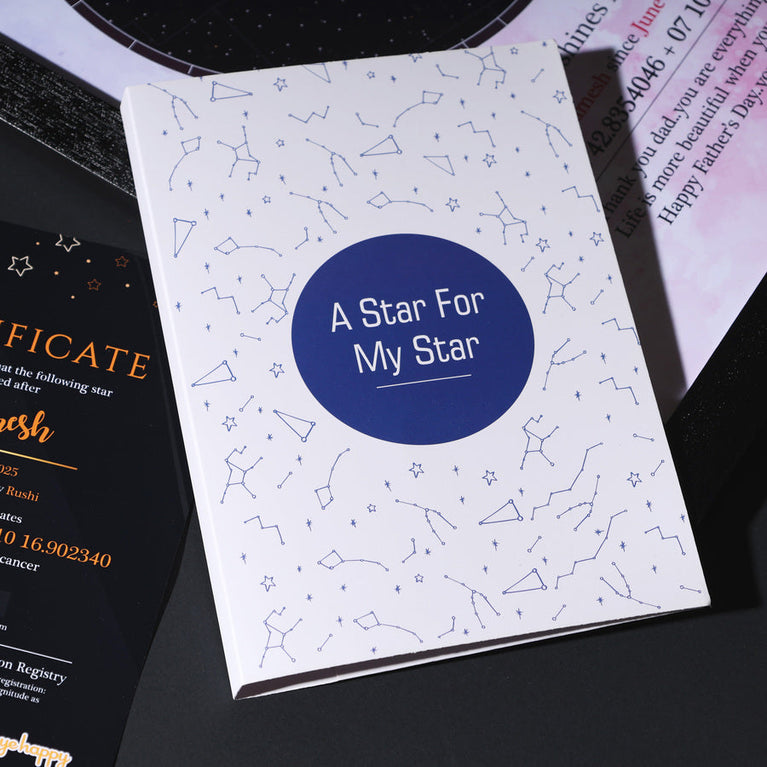 Dads are our real-life superheroes - strong, steady, and always shining. Let’s honour them with something as timeless as their love.Name a star after your dad and surprise him with a gift that’s out of this world. All you need to do is share his name, zodiac, and a special date - and we’ll name a star exclusively for him.The star comes customized with your father's name and a constellation chart showcasing the exact location of the star. You can also add a personalized message to make it even more touching.How does 'Name a Star' actually work?This unique service utilizes the 'Star Dedication Archive,' a comprehensive database of recognized stars in our solar system with their precise coordinates. Once a star is dedicated, it receives a special name and a certificate is generated for it. The registration number on the certificate provides exclusive access to the star's details in the archive, ensuring that no other star will bear the same name.Specifications :Size of the frame (with acrylic glass) - A4