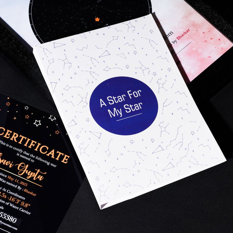 Moms are the guiding light of our lives. They deserve the universe. Let's give them one then.Name a star after your mom and frame it with love, complete with her name and constellation details. Simply share her name, select the zodiac and the date, and a star will be named exclusively for them.The star comes customized with your mother's name and a constellation chart showcasing the exact location of the star. You can also add a personalized message to make it even more touching. How does 'Name a Star' actually work? This unique service utilizes the 'Star Dedication Archive,' a comprehensive database of recognized stars in our solar system with their precise coordinates. Once a star is dedicated, it receives a special name and a certificate is generated for it. The registration number on the certificate provides exclusive access to the star's details in the archive, ensuring that no other star will bear the same name. Specifications -Size of the frame (without glass)- A3 (29.72 x 41.91 cm)Please note that Oye Happy is a facilitator for the naming service, GiftYourStar, which is an Accredited Registrar of the Star Dedication Archives. The star can only be booked for the current year, not for previous years. If you input the date of the occasion as 17/03/1987, the star will automatically be booked for the current year, regardless of the entered date. If the sender's name is not provided, we will list it as "Star is named by Special Person" on the certificates