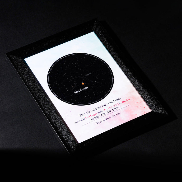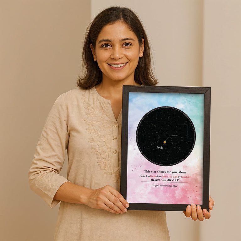 Moms are the guiding light of our lives. They deserve the universe. Let's give them one then.Name a star after your mom and frame it with love, complete with her name and constellation details. Simply share her name, select the zodiac and the date, and a star will be named exclusively for them.The star comes customized with your mother's name and a constellation chart showcasing the exact location of the star. You can also add a personalized message to make it even more touching. How does 'Name a Star' actually work? This unique service utilizes the 'Star Dedication Archive,' a comprehensive database of recognized stars in our solar system with their precise coordinates. Once a star is dedicated, it receives a special name and a certificate is generated for it. The registration number on the certificate provides exclusive access to the star's details in the archive, ensuring that no other star will bear the same name. Specifications -Size of the frame (With acrylic glass): A4.Please note that Oye Happy is a facilitator for the naming service, GiftYourStar, which is an Accredited Registrar of the Star Dedication Archives. The star can only be booked for the current year, not for previous years. If you input the date of the occasion as 17/03/1987, the star will automatically be booked for the current year, regardless of the entered date. If the sender's name is not provided, we will list it as "Star is named by Special Person" on the certificates