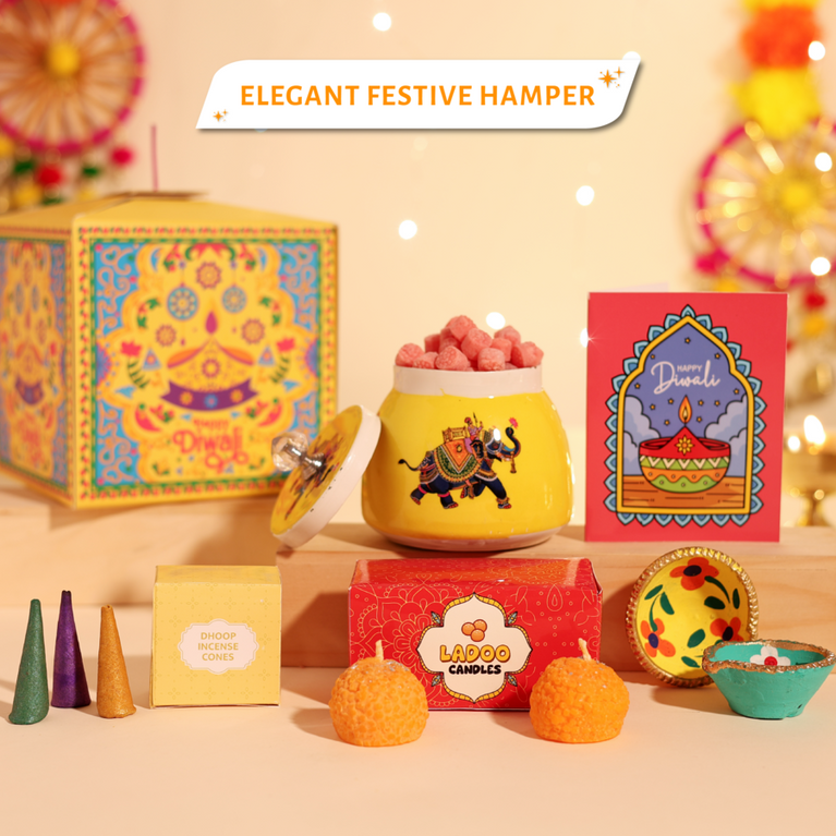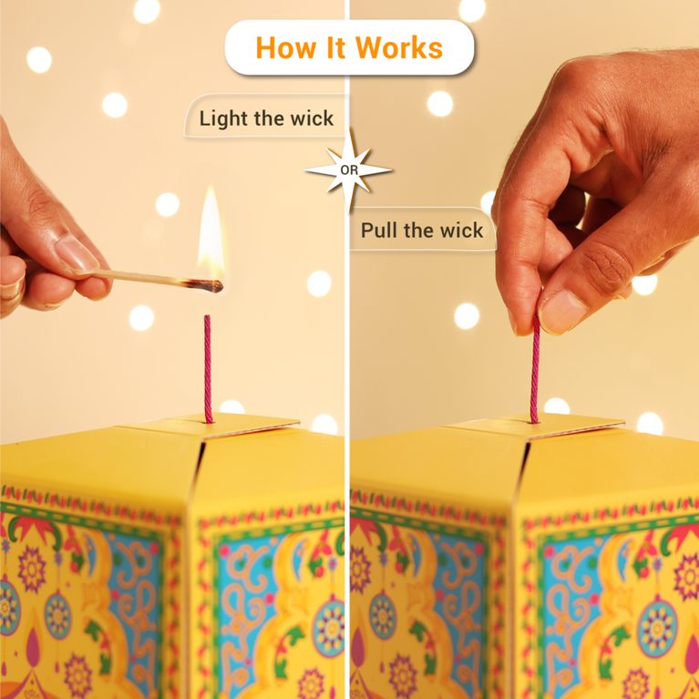 Introducing India’s First Patakha Box — a one-of-a-kind festive surprise that looks like a cracker but opens up as a magical hamper. It’s designed to give you the joy of lighting something special without any noise, or pollution.Celebrate Diwali with a thoughtfully curated hamper that includes:Paan candyLaddoo CandlesIncense ConesA beautiful Greeting CardDesigner Colorful DiyaHow It Works :The Patakha Box is simple and safe to use:Light the wick or pull it gently.Watch the box unfold in a magical way.Experience the joy of festive unboxing with none of the mess or worry.Specifications -Size of the box: 14 cm X 14 cm X 14 cm
